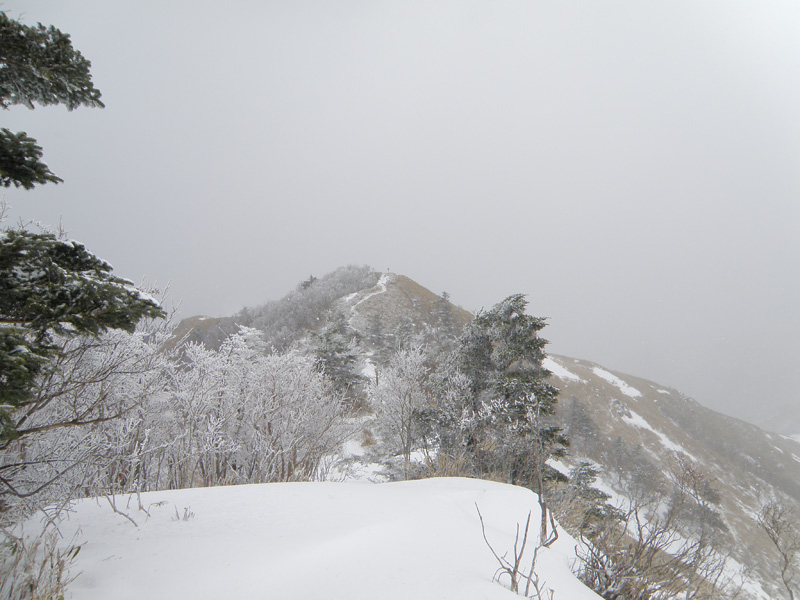 剣山に向かって下っていく。 途中の岩陰でおじさんが一人休んでいた。 これから次郎笈を目指すとのこと。 西島方面の分岐を通過し、剣山への上りに入る。 トレースがあるので、じっくりと歩いていく。 先ほどとは違く、こちらはペースさえ崩さなければ息があがらない。 山頂直前でもう1人すれ違った。 西島方面分岐から山頂まで450mなのだけど、こちらは20分ちょいで到着。 標高差も距離もこちらのほうがあるのに、かかった時間が半分。 これがトレースあるかないかの違いかな。