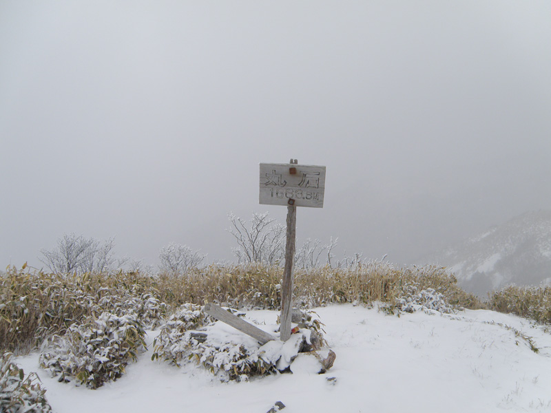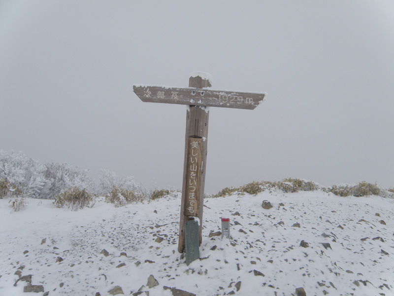 で、ようやく次郎笈山頂に到着。 景色は全く見えず。 気温はマイナス9度。