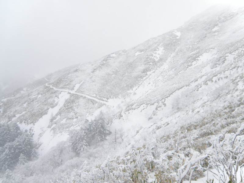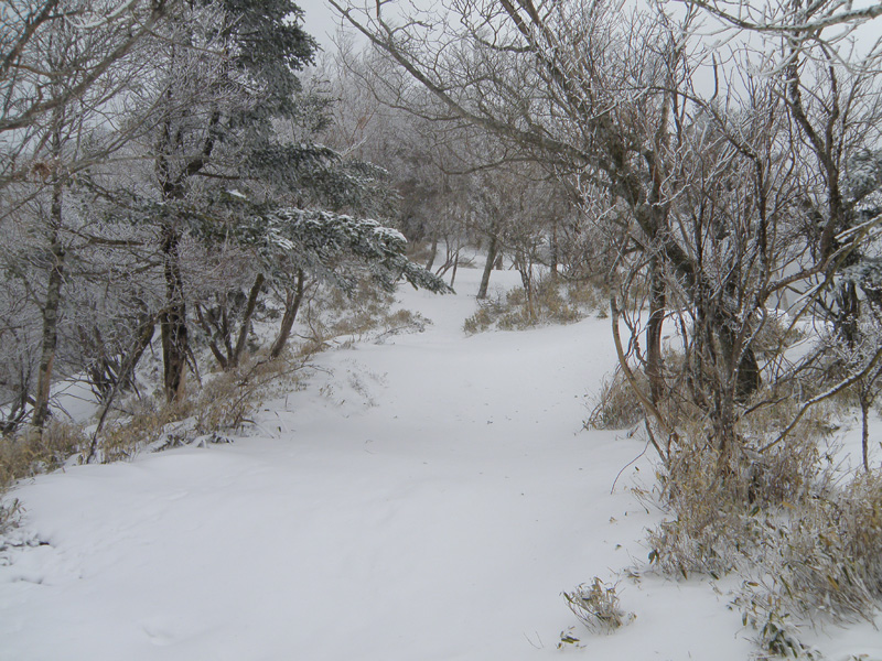 アイゼンつけて先に向かう。 道を示すテープなどはないが、夏の時期でも、道の場所以外歩けないような場所なので大丈夫だろう。 過信しすぎると危ないけど、鹿も登山道を歩いた跡があるので、鹿の足あとをたどって行く。 グネグネとワインディングしながらどんどん登って行く。 左右にグネグネなっていた道が、縦にグネグネなりだしたら、稜線までもうちょっとの目安、と自分の中で決まっている。