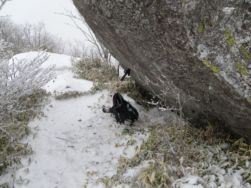 トラヴァースルート分岐のちょっと上に大きな岩があり、その岩陰で風が凌げることを、登ってくるときに発見したので、そこで休憩しようか。