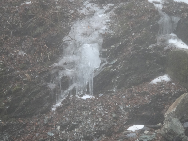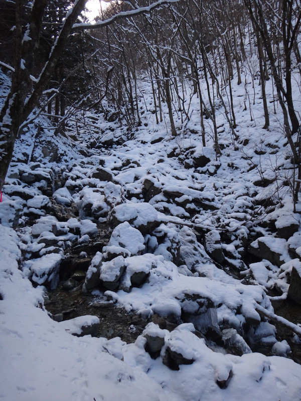 出だしはアイゼンつけずに出発するが、途中で雪が出現。 雪と言っても20mくらいの区間だけだったけど。 一部氷結してるし、今後もこのような部分が出てくると思うので、つける必要が全くないけど、アイゼンをつけることに。