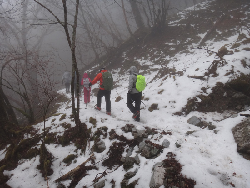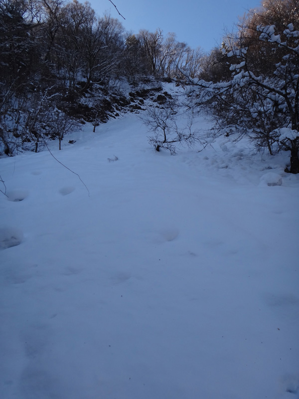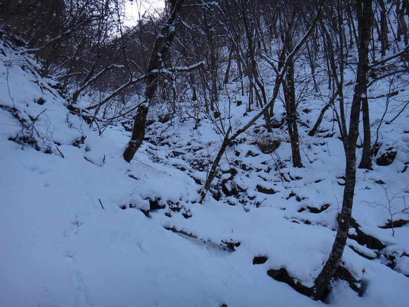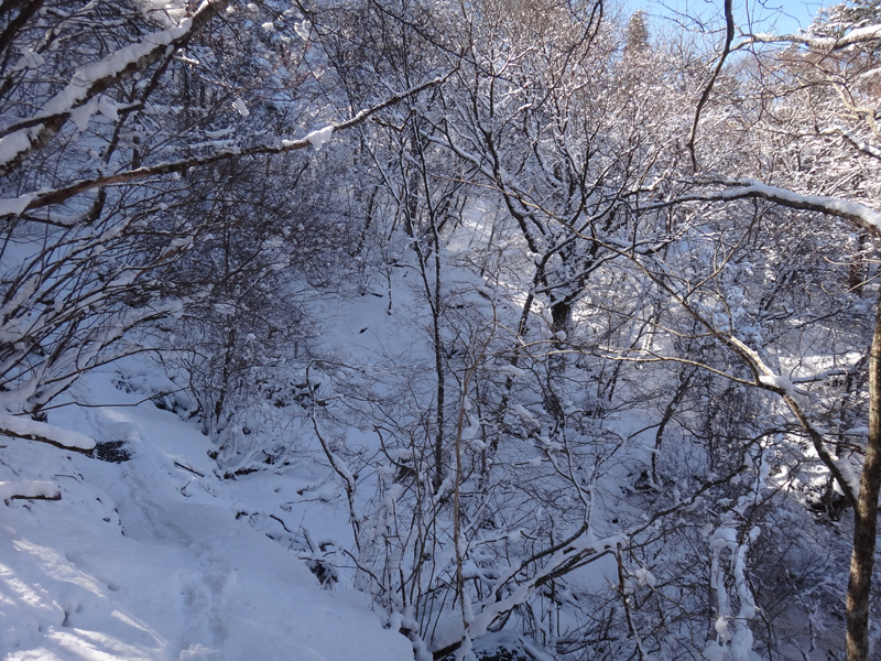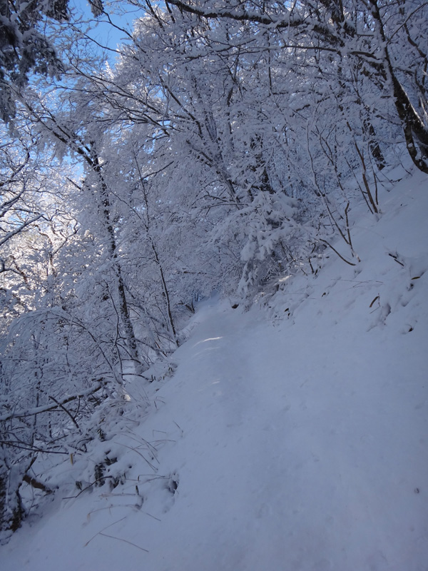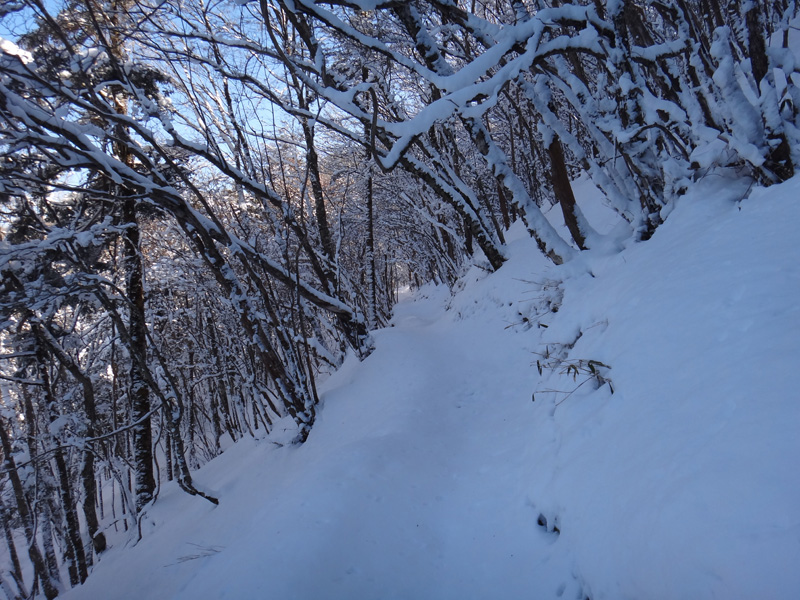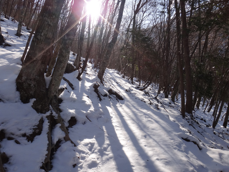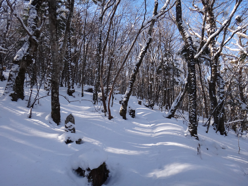 北斜面の樹林帯を歩くので、尾根ルートより雪が積もっていることを期待。