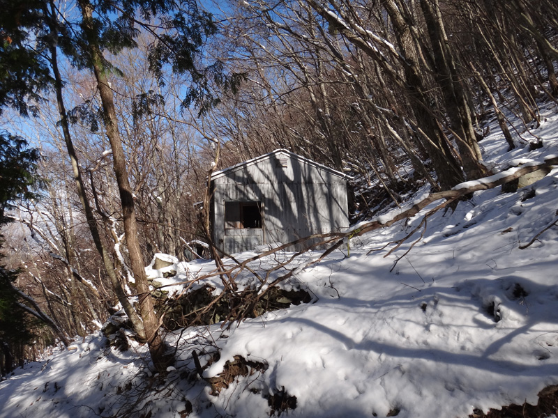 ここからの道は、過去2度歩いているはず(剣山方面から追分に向かって)なのだけど、全然覚えていないや…… 穴吹川源流を通過し、小さな小屋が。 小屋の後ろには巨大な岩壁がそびえている。 格好いいなぁ……