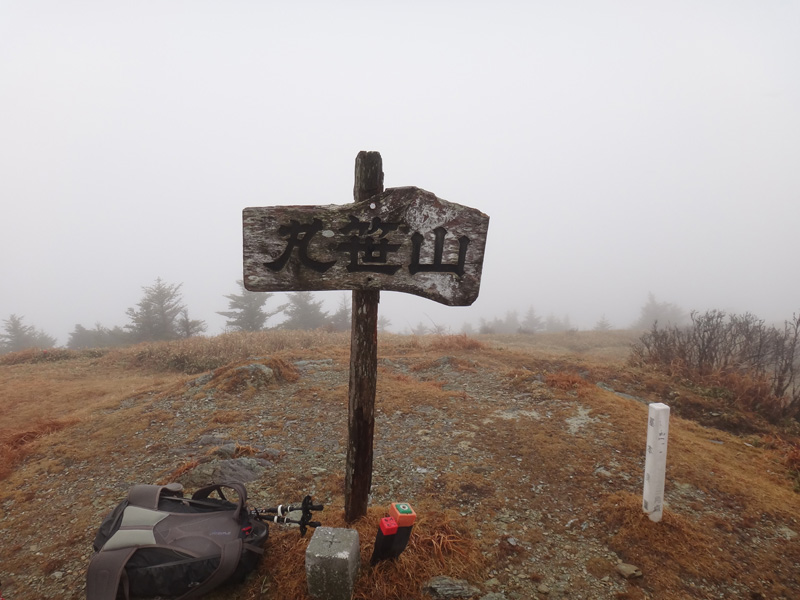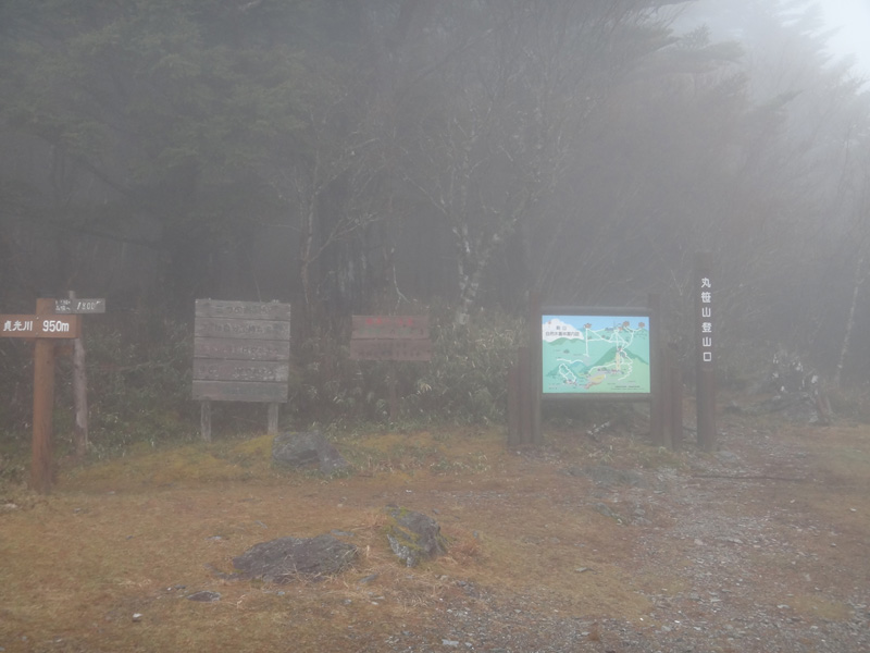 しばらく歩き丸笹山山頂に到着。 雨のため、山頂ではあまり滞在せずすぐに下山する。 下山は見ノ越方面に降りるルート。 地図上には描かれていないルートだけど、下りで1回、登りで1回利用しているので、だいたいの道筋は分かる。