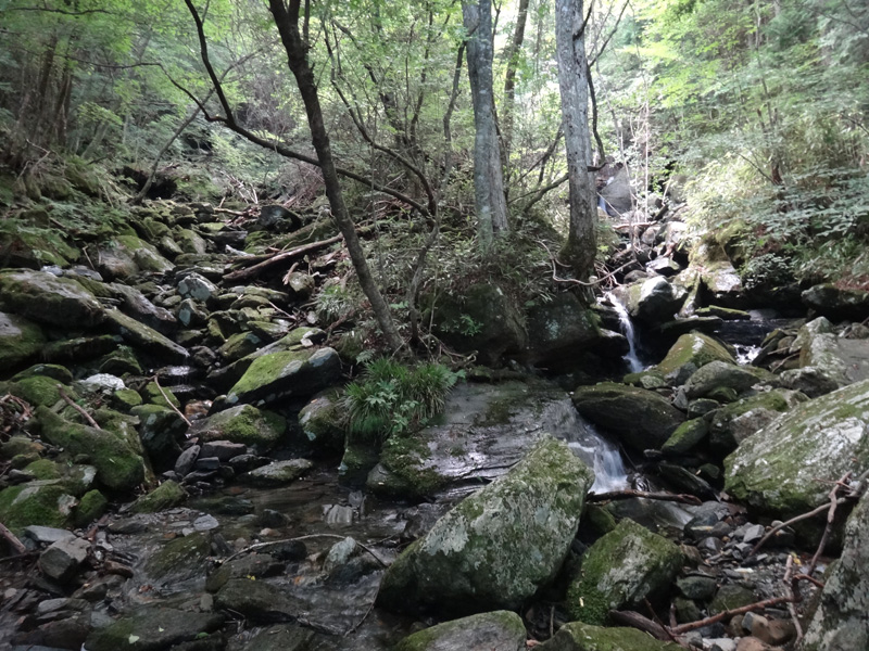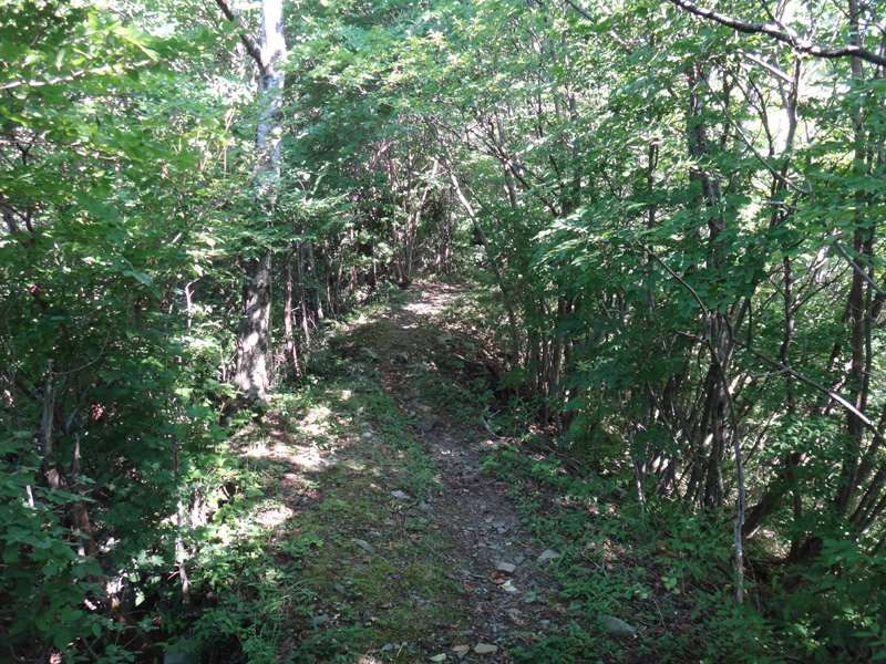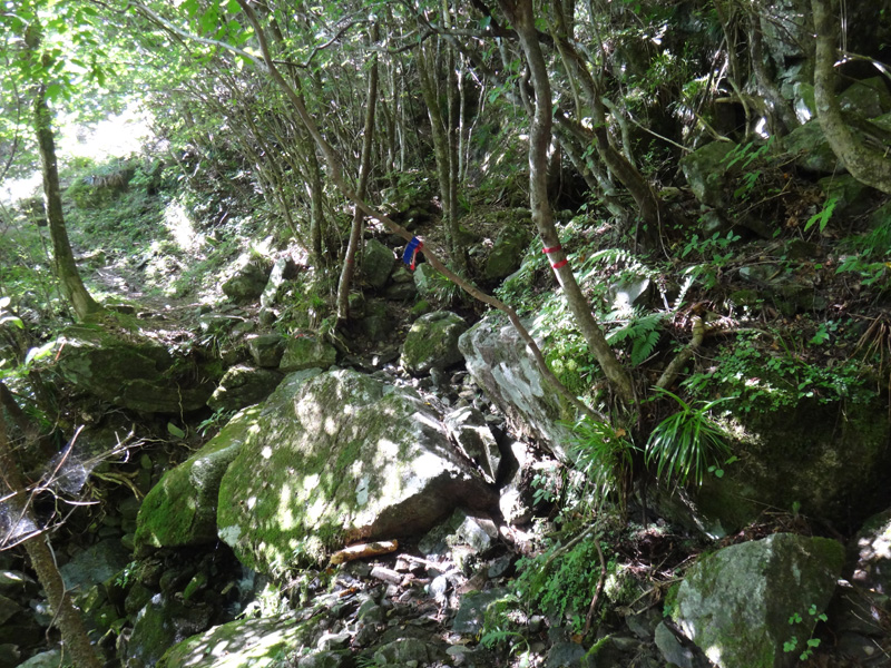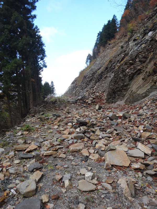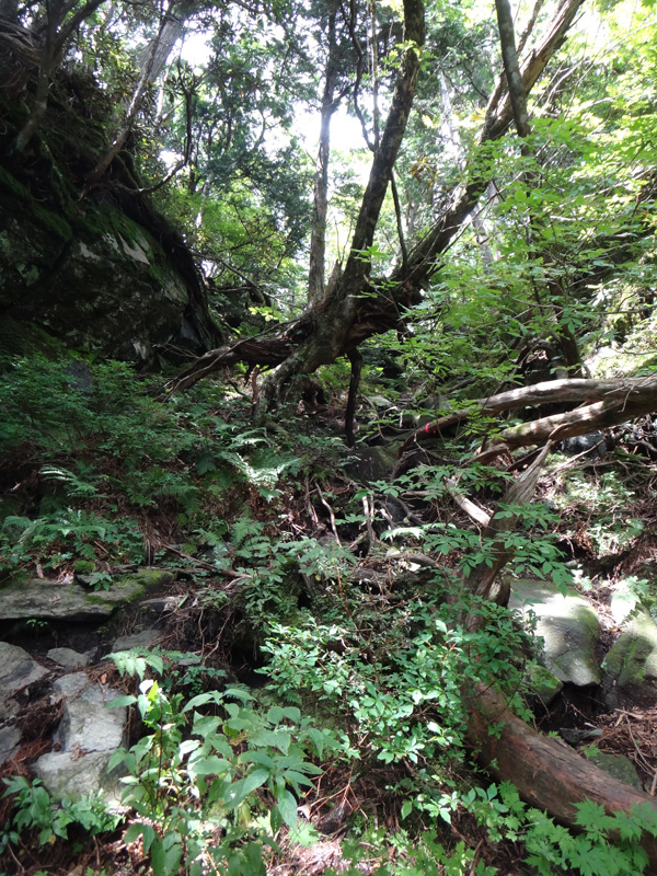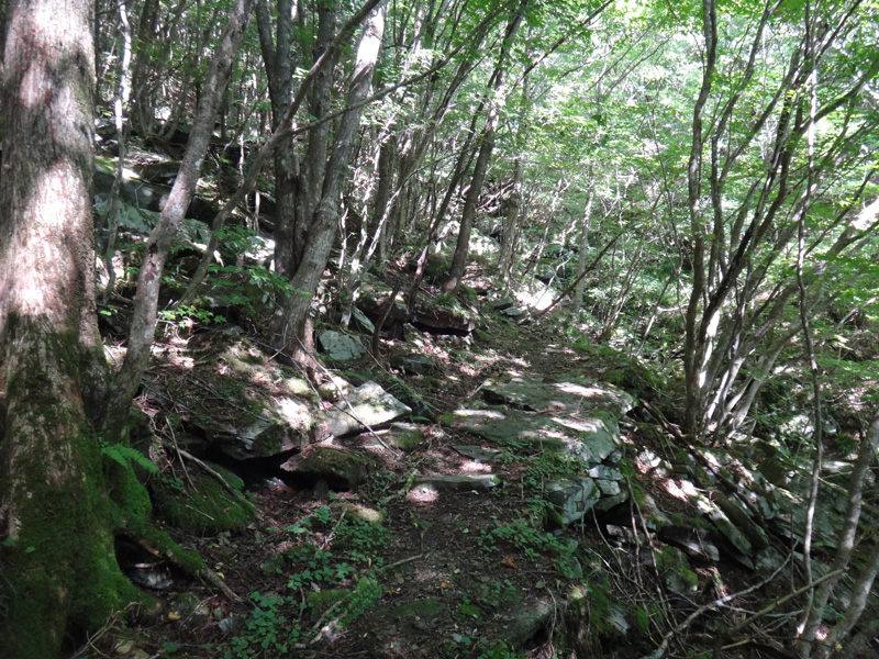 ひたすら登りの道。 途中に石垣とかあったのだけど、こんな山奥に人が住んでいた気配があるとは… 赤石鉱山とかが栄えていた時代のものなのかな?