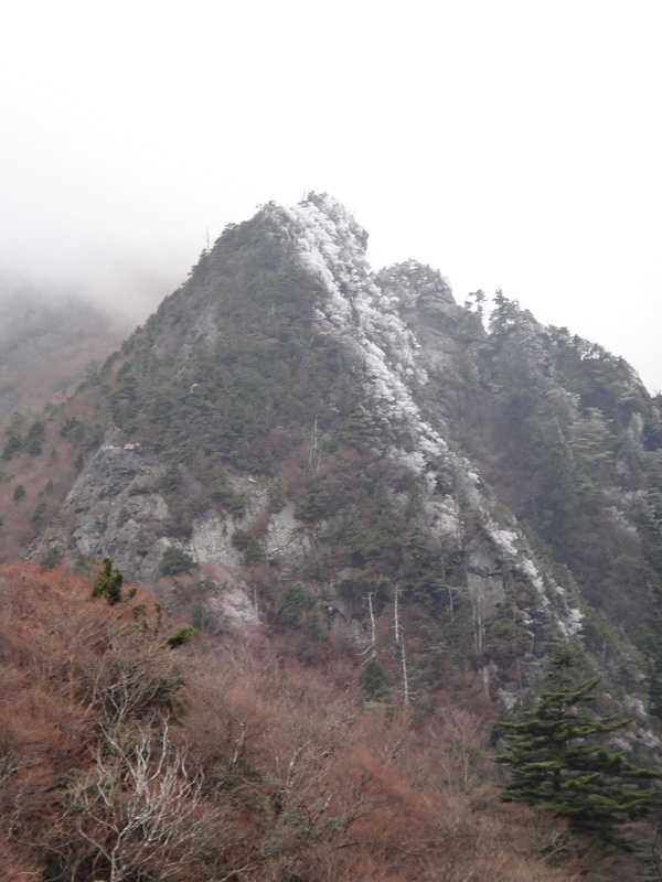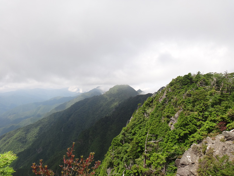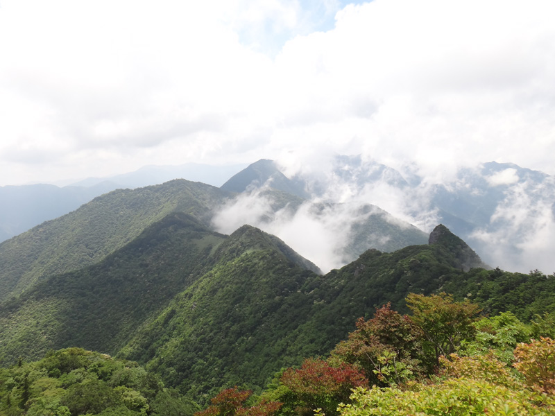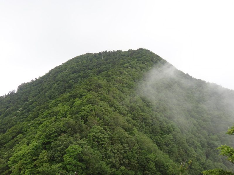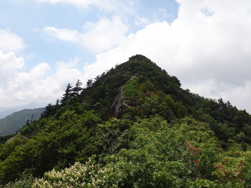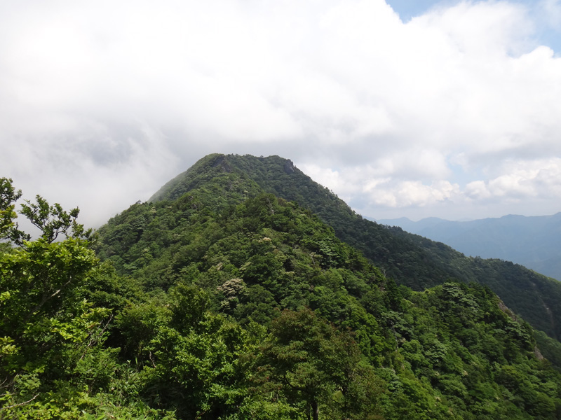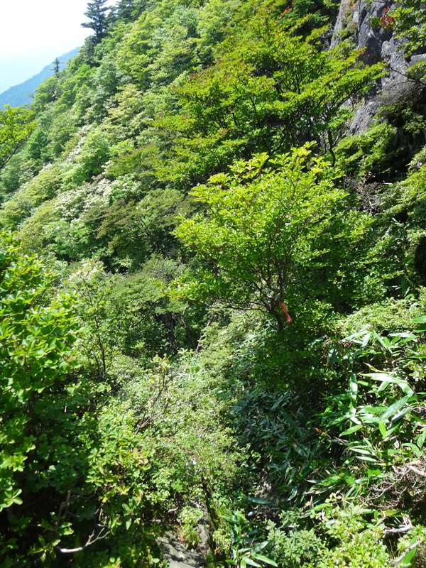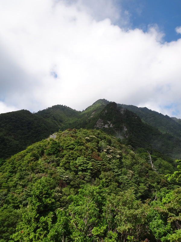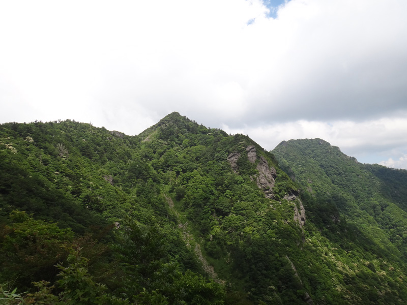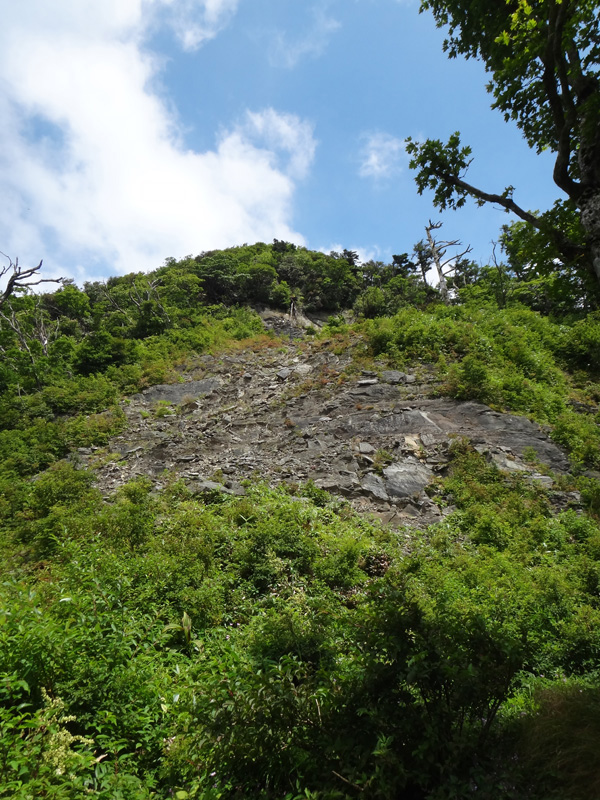 ここから先の道は一気に傾斜がきつくなる。 目の前にはピークがいくつか見え、豪快な岩場が見える。 この山、格好いいなぁ。 こんなスケールの山に登れるのは幸せ。 道は急できついけど、楽しみながら歩ける景色だな。