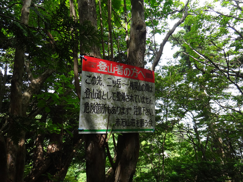 以前、このあたりで遭難した人がいるらしく、ここから先の道について注意を促す看板が掲げられていた。