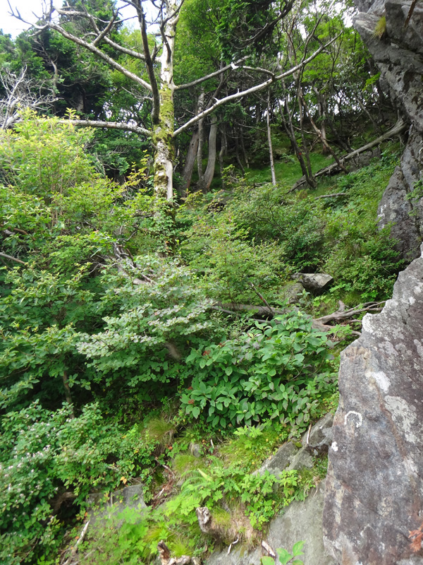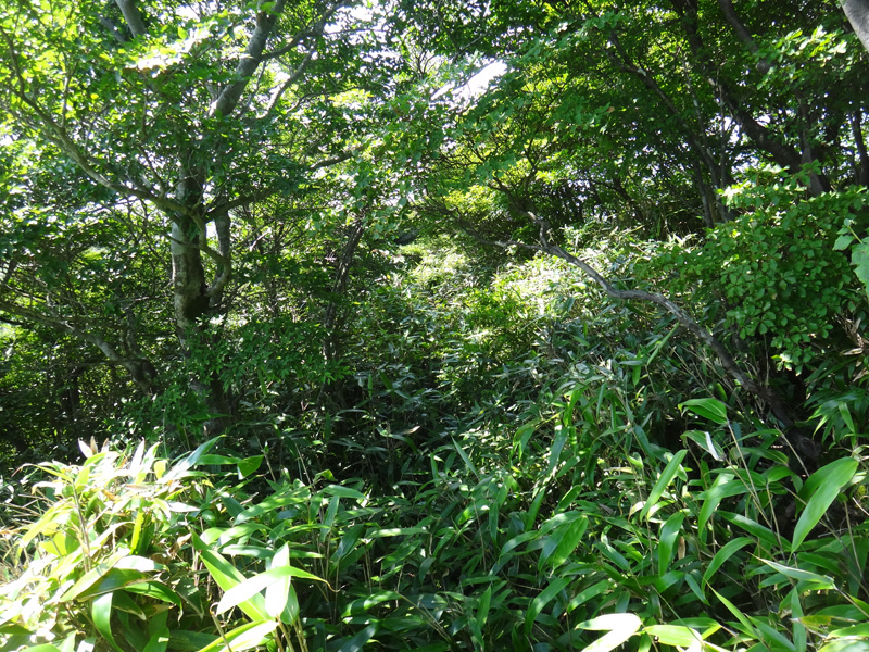 ここからの道は、黒岳直前よりもきつかった。 胸くらいまでの高さの藪や笹がずっと続く。 足元はほとんど見えない。 道もあまりわからない。