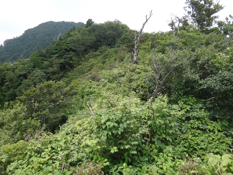 断崖の下を回り込んで再び稜線へ。 黒岳が近づく。 が、藪こぎがひどい。 なかなかペースが上がらないし、スパッツ着用してないため、靴の紐がすぐにほどける。 きつく結んでるのだけど、藪で引っかかってるらしい。