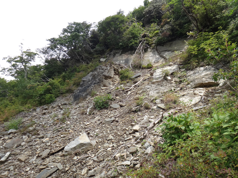 黒岳を出発してすぐ、「これが危険地帯か!」という場所に出くわした。 崖が崩落している。 その崩落したど真ん中を斜めに縦断するのだ。