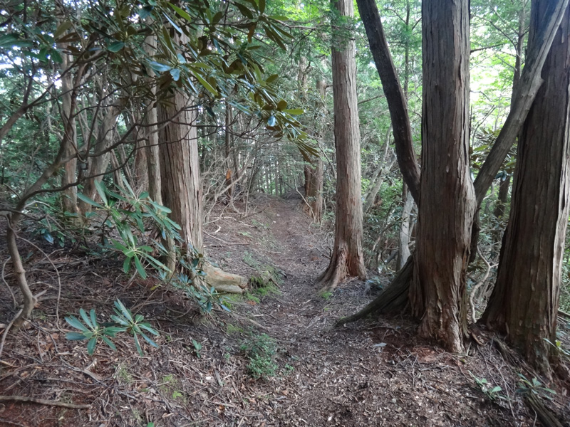 造林地帯に入り、だんだんと標高が下がってきた。 樹林帯の中は薄暗くなってきた。