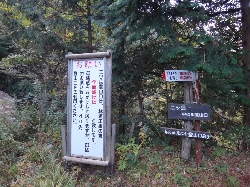 40分ほど歩き、中ノ川登山口に到着。 看板があり「林道工事のため全面通行止め」と書かれている。 が、いつの看板だろうこれ。