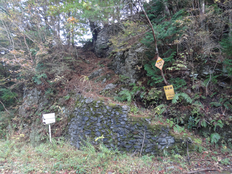 ここから山に入る。 北側登山道は人があまり来ないうえに、崩落のためさらに人は来なくなっている。 道自体は広く迷うような所はなかったのだけど、荒廃し始めている……