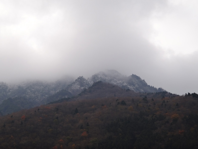 たまに山頂の方が見えるが、木々が白く色づいている。 樹氷か?