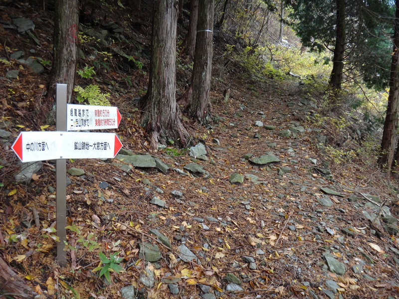 引き返し先ほどの看板まで戻る。 看板の裏から道が伸びているのだけど、看板が示す「峨蔵越」とは全くの逆方向。 2分くらい歩いてみたが、これも全く違う方向に進んでいる。