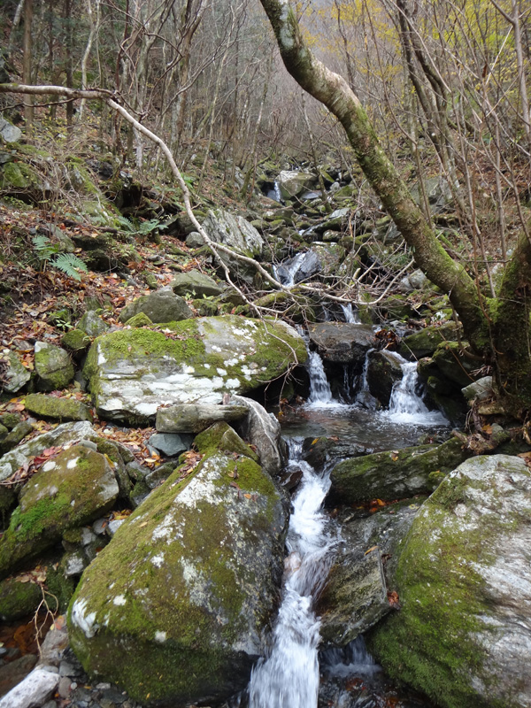 小さな沢をいくつか越えて、峨蔵越まで到着。 なんだあ今日、ものすごい疲れる… 車から、まだ3時間ほどしか歩いていないのにクタクタ。 しかもメチャメチャ喉も乾く。 もう700mlほど飲んでしまった。 水分はお茶が2Lと、水が500ml。 このペースで消費していったら足りないかもしれない…