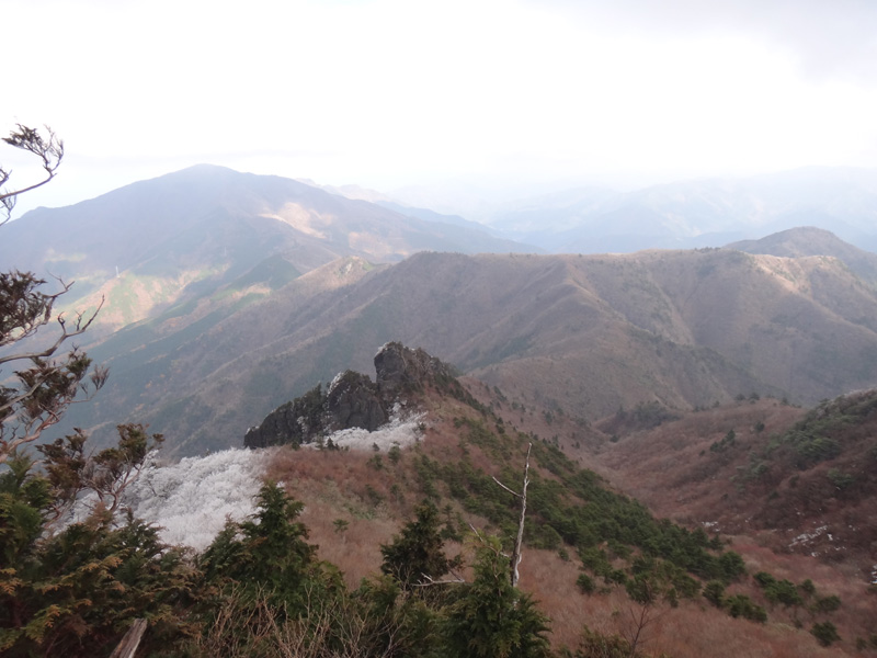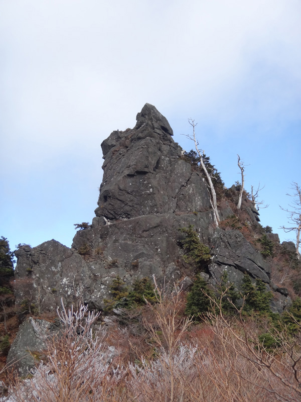 お昼ごはんも食べて下山することに。 下りは5分くらいだけど、半分凍りついた斜面があるので、そこを歩くために軽アイゼンを装着。 つけるの面倒だったけど、リスクを減らすためにしかたないか。 その区間はなんなく通過し、すぐに軽アイゼンを外す。 くだりも雪のある区間はグイグイと下りて行き、すぐに鯛の頭まで到着。 そこから先もグイグイと下りて行き、峨蔵越まで。