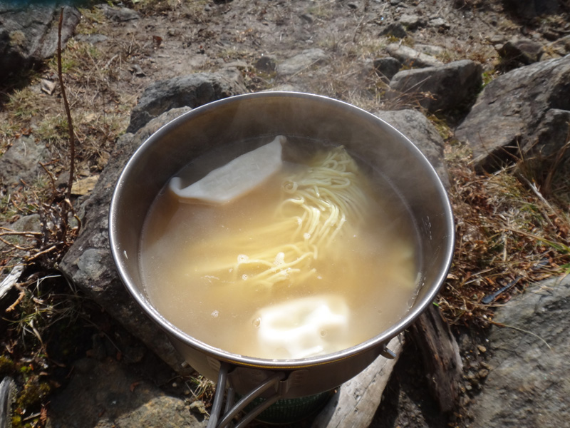 お昼はおにぎり2つとインスタントラーメン。 もう暖かいのに、厳冬期用のガスカートリッジを持ってきてしまった。 このガスは単価が高いので、冬以外使えるタイプのものに交換しよう。 値段が1.7倍くらい違う。