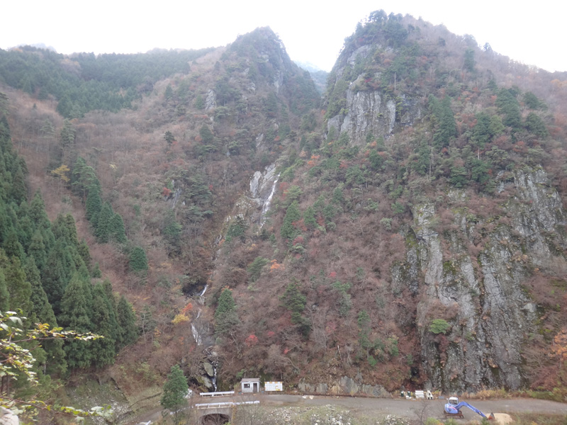 30mくらい歩いたら、工事中の林道に出た。 林道を少し歩いていたのだけど、登山道らしきものが見つからない…… そのまま歩いていたら、滝の下についてしまった。
