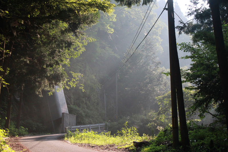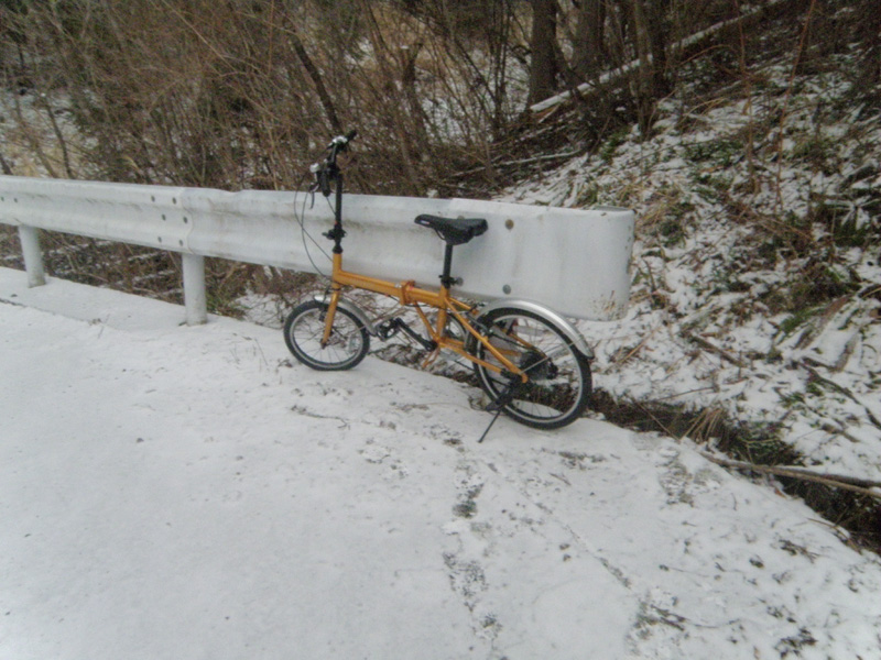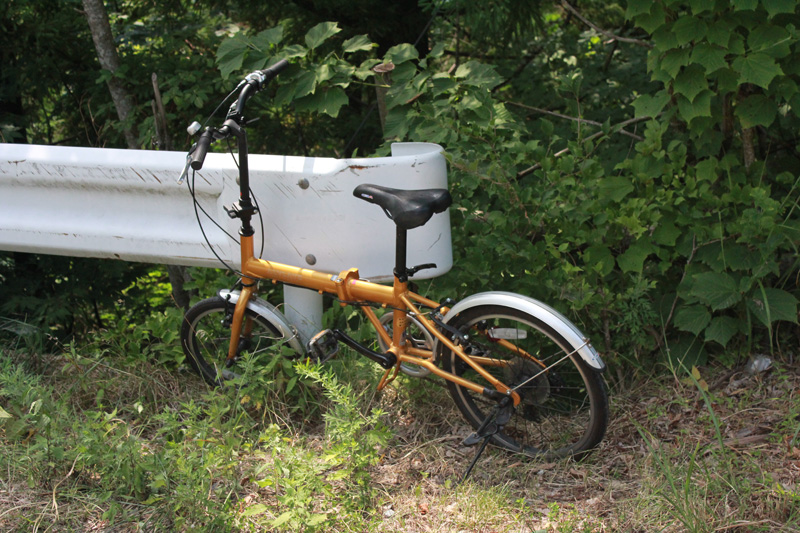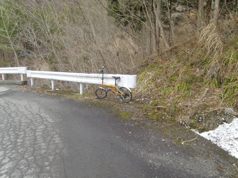 しばらく我慢して走るが、これ以上進むのは危険に感じた。 そのため、ここに自転車を置くことに。 ちょうど川を渡った場所。 地図で目測で峠からの距離を見るけど、2kmくらいだろうか。 このくらいならここでも、いっか。