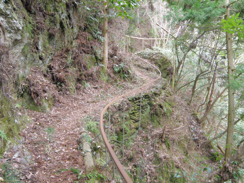 ここからの先の道は更に急になった。 階段を下りているより急な道。 何だ、この道? 急すぎる…… 定期的にピンクテープはあるので、道は合っているのだろう……