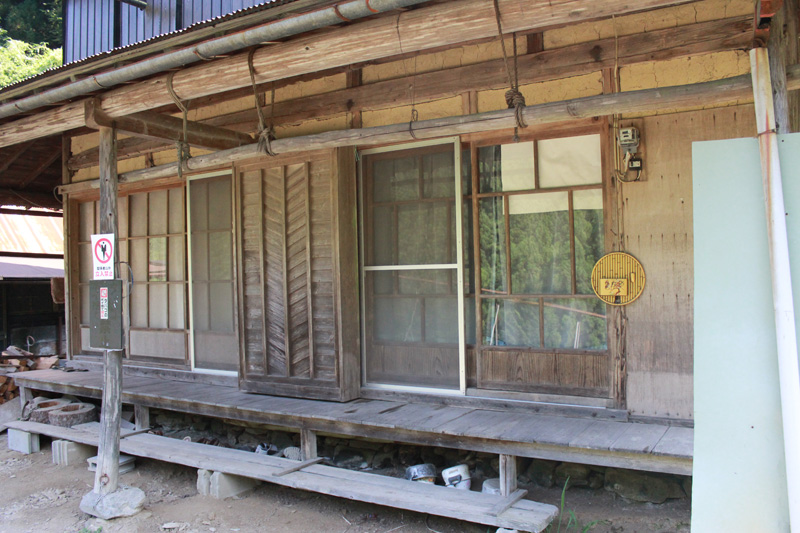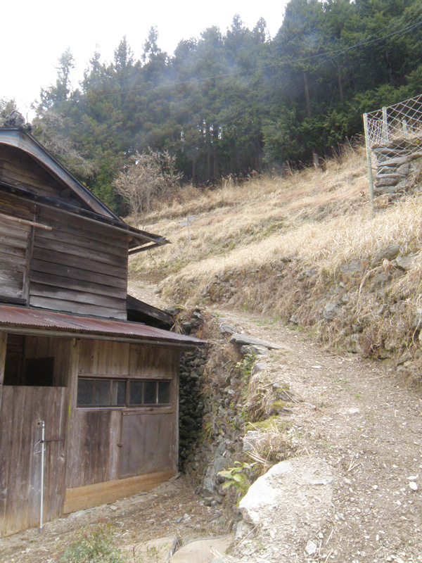 そのまま道を進んでいくと、また民家が。 壁にはフライパンや鍋が大量につり下がっている。 そして、民家の軒下に道が延びている。 この道は、登山道じゃなくて、「民家に行く道か?」と思ったが、軒下を通りぬけて道は続いていた。 これが最終民家かな。 その奥からは樹林帯の中になっており「登山道」と札が下がっていた。