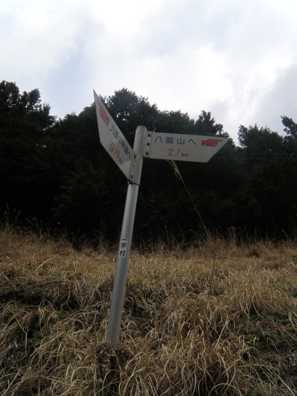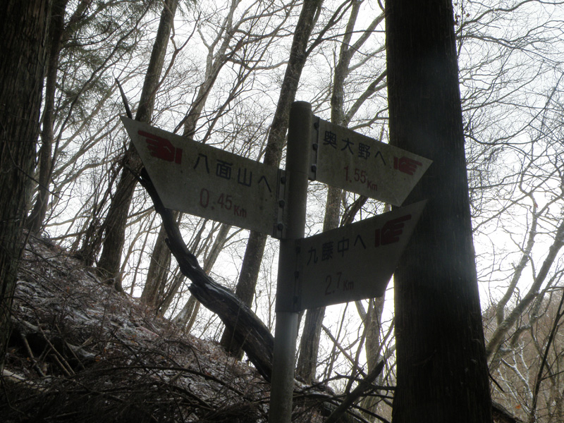 けっこう息をあげながら登って行く。 「八面山へ1km」の看板が出現。 ここまでも結構きつかったけど、まだ1kmもあるのか。 奥大野方面と合流するので、この登りはあと500mくらいか?