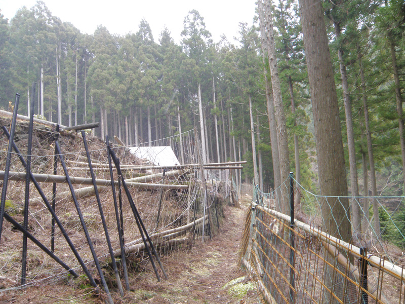登山口から山の中に入っていく。 登山道もけっこう荒れている。 途中の民家跡や民家の所に人工的な柵がしてあったりするのだけど、その柵も倒れていたり。 去年の雪は相当だったんだな……