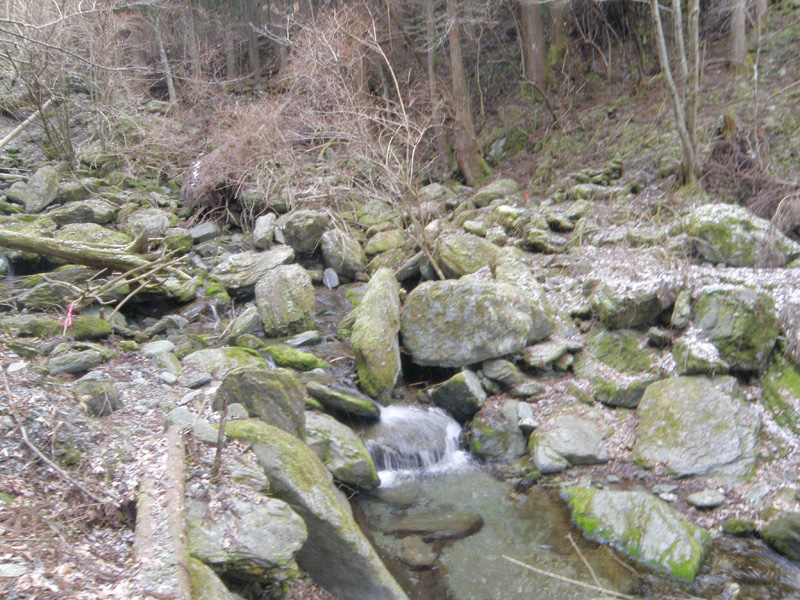 「20mくらい左に登って」が、犬がいた民家のところの事だ。 「まっすぐ行くと川に下りてしまう」「大きな岩があって50mくらい左に登って」は、ここ付近の事だな。