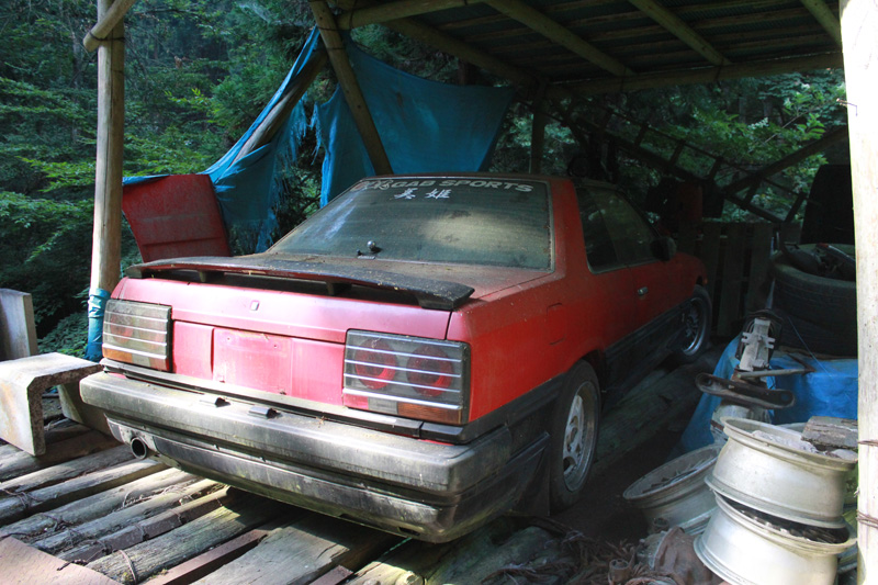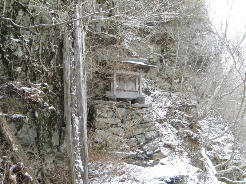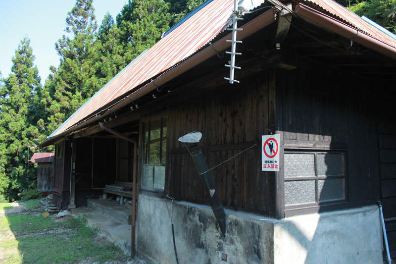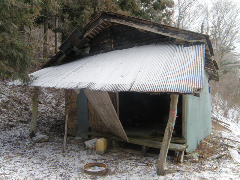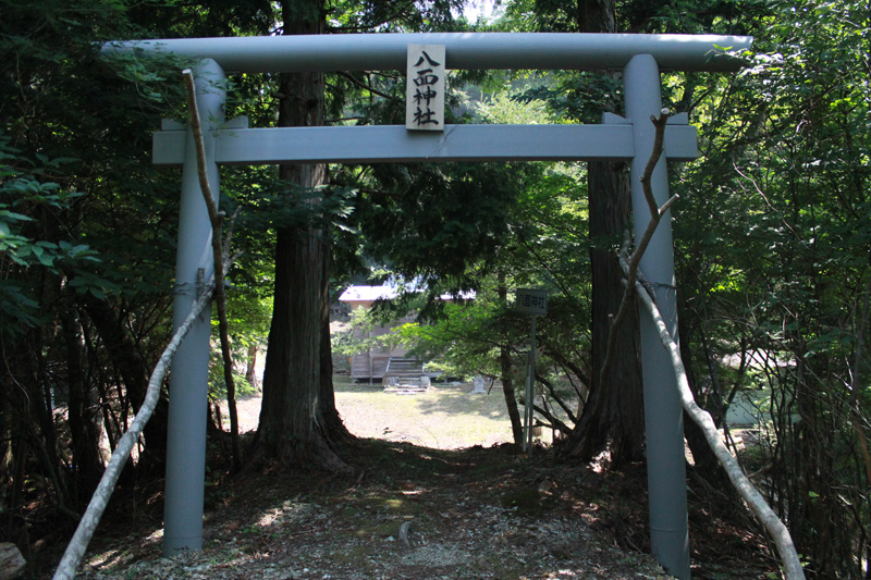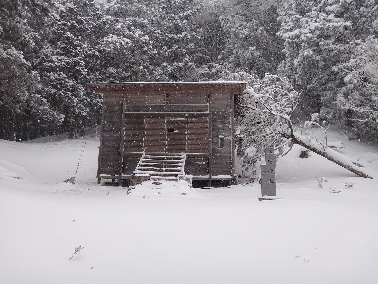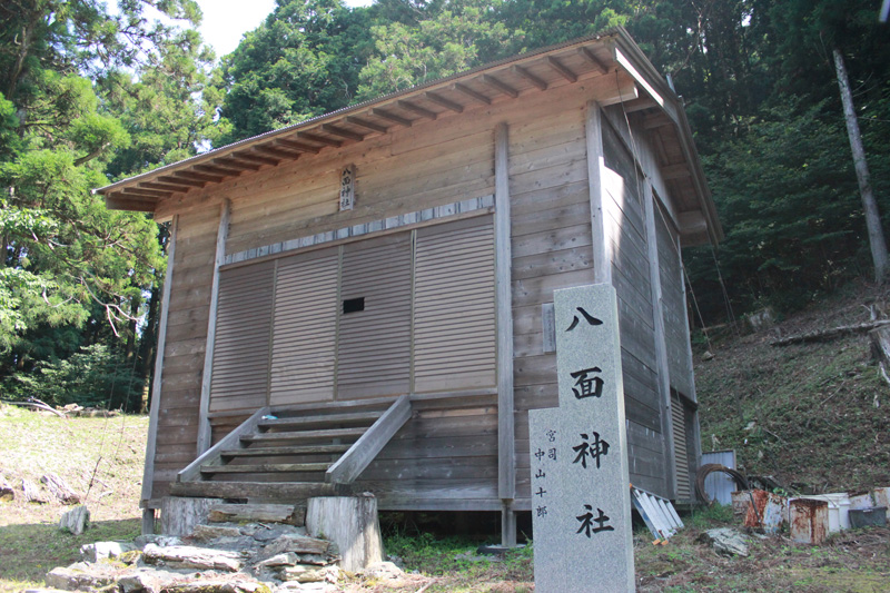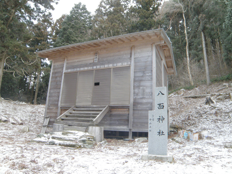 そのまま山頂方面を目指す。 山頂のすぐ下に「八面神社」というのがあり、そこに廃屋があったので、ここで休憩することに。