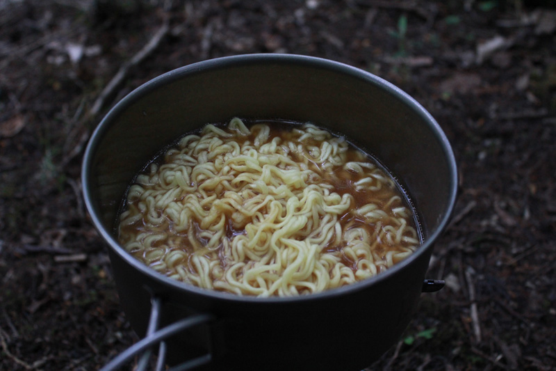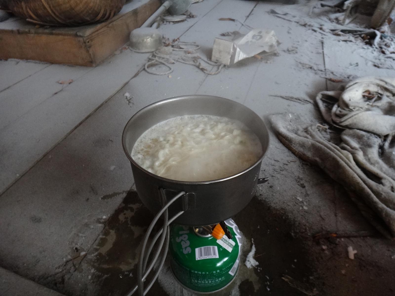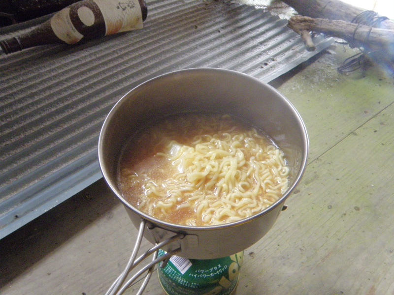 今日は山でゆっくり食事を楽しむのが目標だったので、インスタントラーメンを持ってきている。 さっそくお湯を沸かしてラーメンを作る。 仕上げに餅を入れて、カップラーメンの完成。