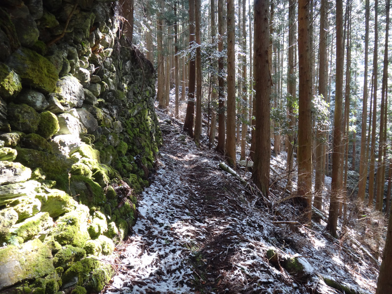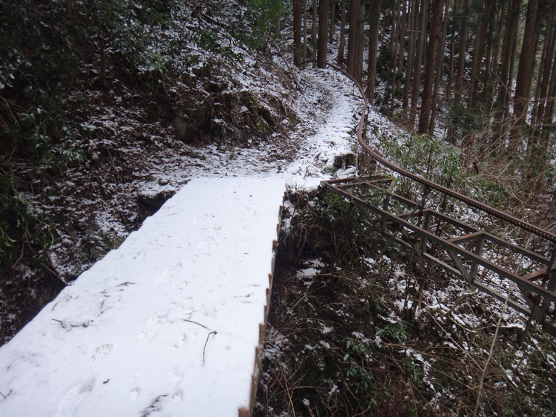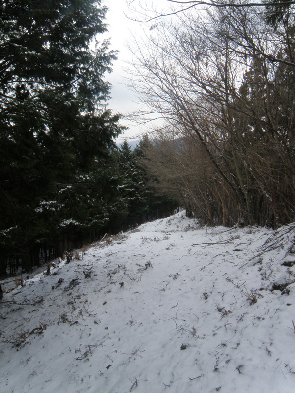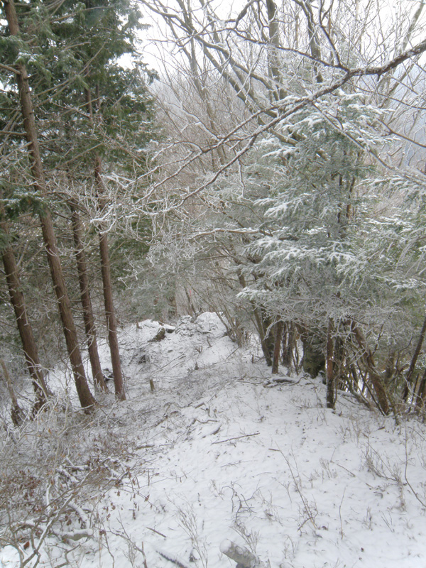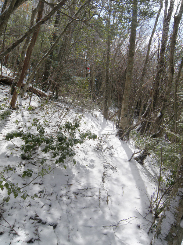 さて、進もうか。 そのまま山頂を通り過ぎて、けっこう急な道を下りていく。 普通なら問題ないのだろうけど、積雪が3cmほどあって、これが逆に滑る滑る。