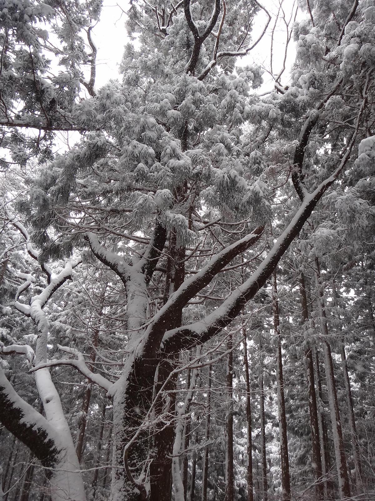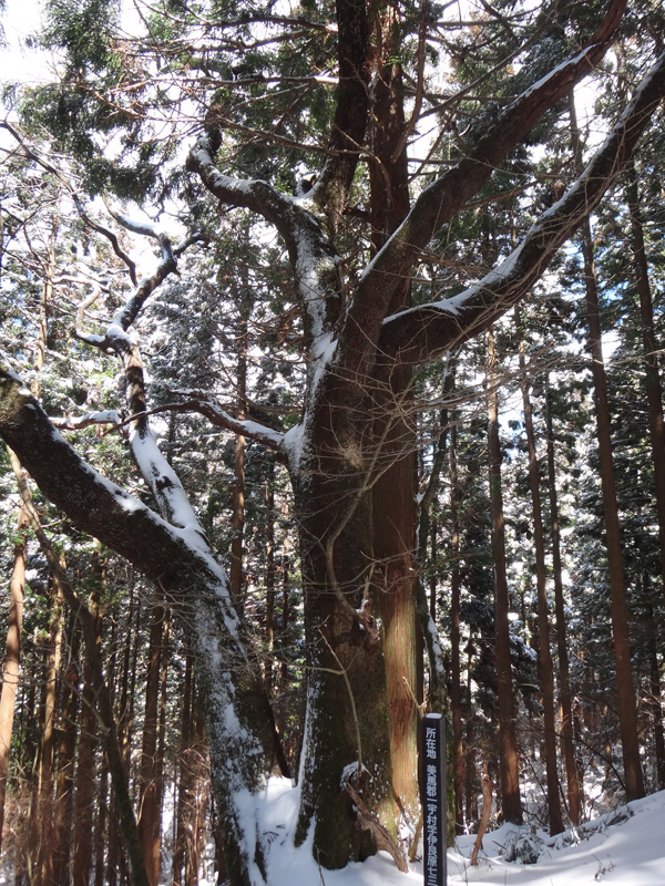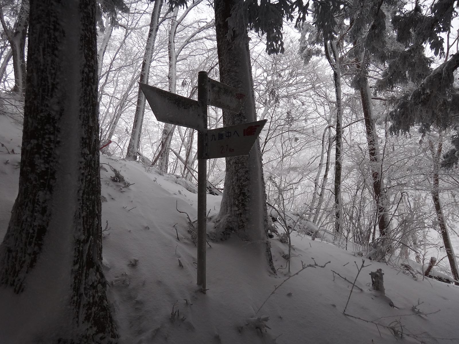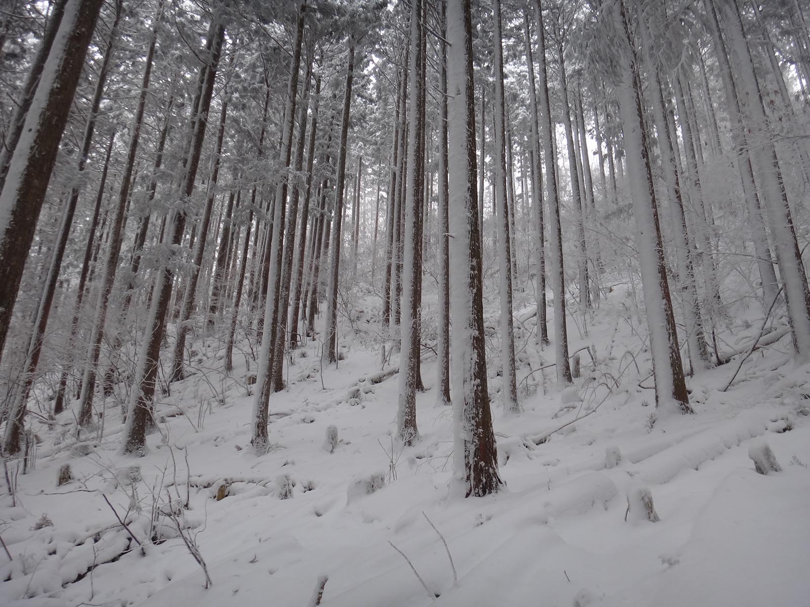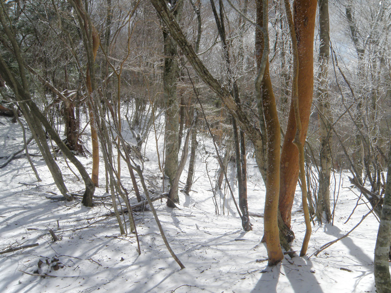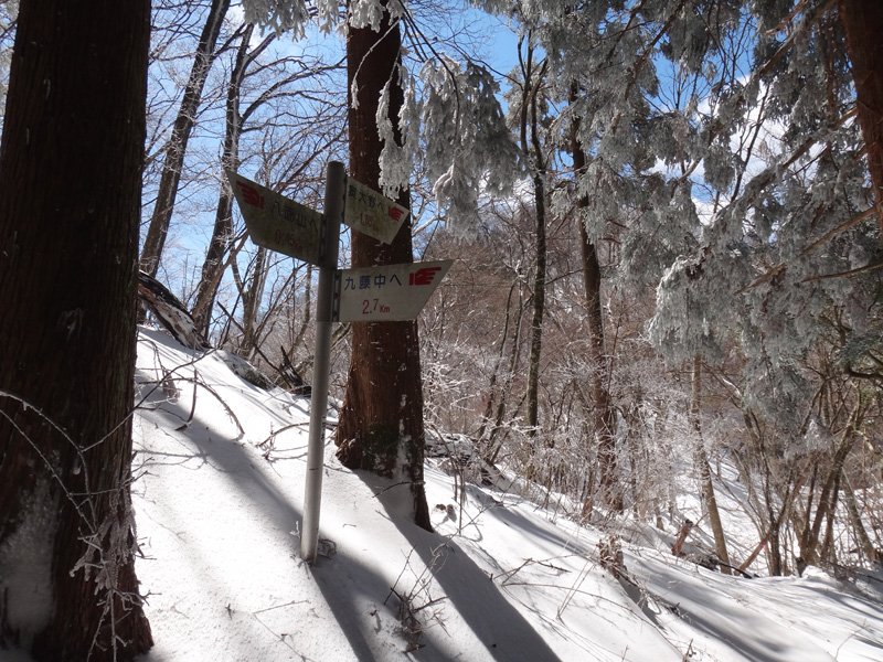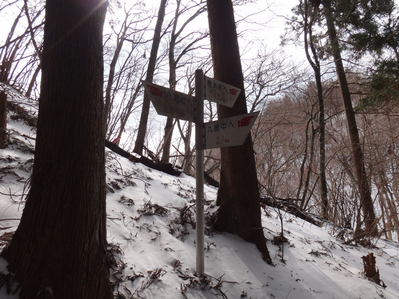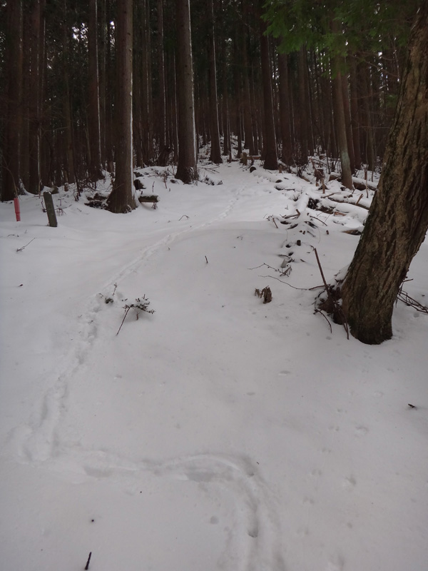 そして、尾根道に挑んでいく。 歩幅を狭くしてストックでバランスを取りながらどんどんと歩いて行く。 猛烈な寒波が着ているとはいえ、所詮まだ1日目。 今年の冬は暖冬でほとんど雪が降っていない。 1日雪が降ったとしても、例年のように週に何度か1ヶ月以上降り続いている山ほど雪は積もっていない。 樹林帯で20cmくらい、木々が無い場所でも30cmくらいしか積もっていないので、ラッセルという程度のものでもないし、足をあげるのも苦労しないし、あまり張り合いがなかったけど、テクテクと登って行く。