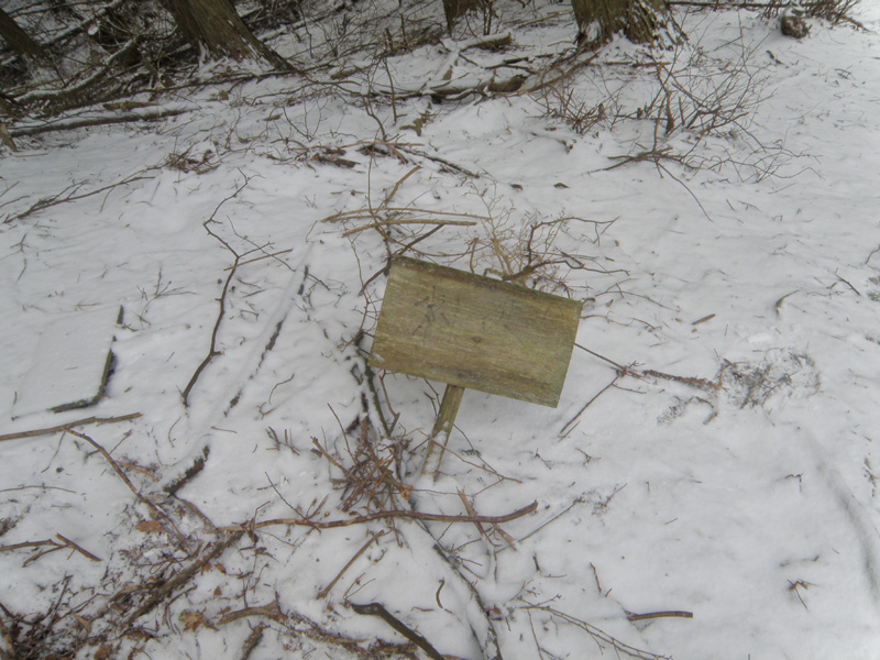 とりあえず、戻ることに。 戻ってる途中に気付いたのだが、山頂に向かって左側、朽ちた看板が倒れていた。 その看板自体の文字は消えていて見えなかったのだけど、すぐ脇に壊れた祠が。