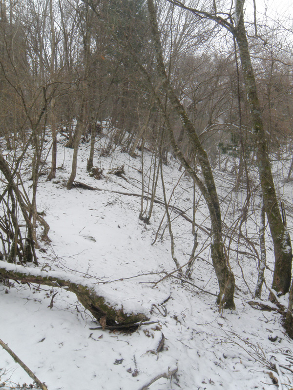 そのまま尾根を東方面に歩いていく。 時々雪が強くなってきたりしながら、歩く。 が、なかなか遠いなぁ。 いったん、樹林帯の木の下で休憩もした。 迷ったところで時間を食って、既にけっこう時間が経過している。
