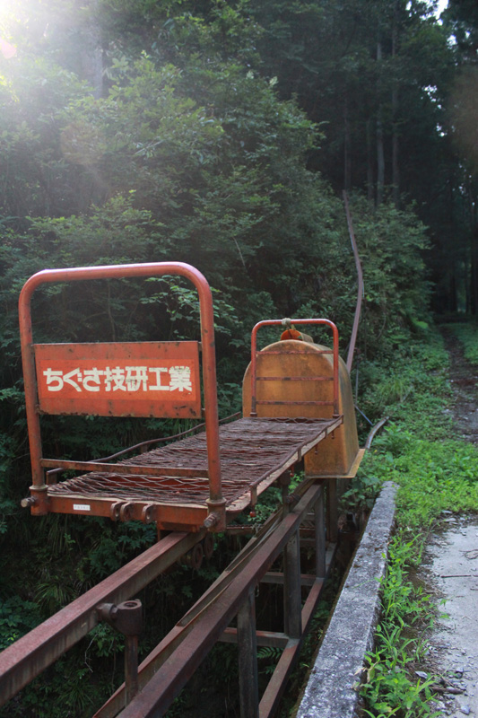 オレも後ろから歩きはじめる。 すぐに荷物用モノレールのレールが出現。 これ沿いを歩いていくことになるのかな。