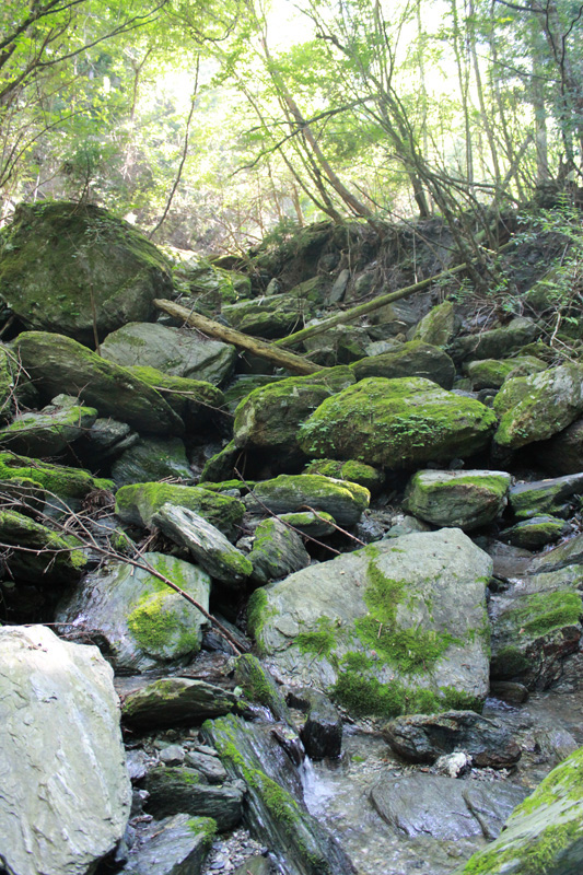 民家の裏からどんどんと山の奥に入っていく。 最終民家を越えて、沢沿いへ。 渡渉ポイントを通過して山の中をもう少し歩くと、もう一度渡渉ポイント。 滑らないように慎重に渡り、少し歩くと大きな岩のある場所が出てくる。