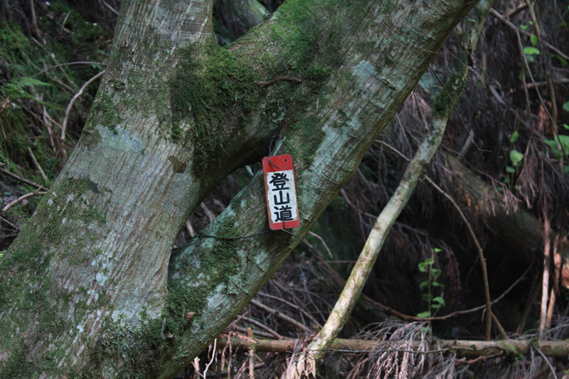 荷物用モノレールの終点付近の民家の裏側を上がって歩いて行く。 再び森の中に入るのだけど、さっきまであった足跡が無くなっている…… 看板は出ているのだけど、初見でこの登山道と看板を発見するのは難しいので、そのまま真っすぐ川の方に歩いて行ってしまったのだろうか…… しばらく歩くと、川の方から正規の登山道に戻っていく足跡が残っていたので復帰したっぽい。