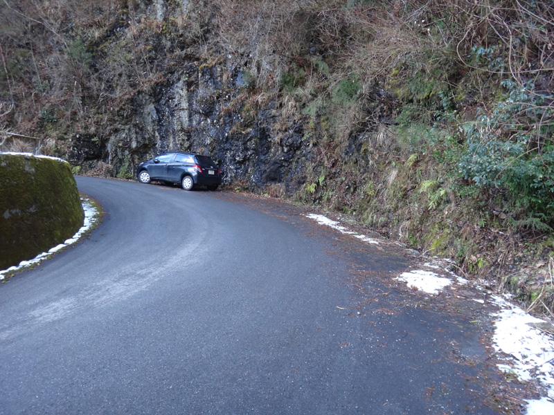 国道438号線を走る。 今日は自転車を積んでいる。 綱付山を下山したら、自転車で車まで戻る。 自転車は綱付山下山したところに「犬石峠」に置く予定。 剣橋を左折し、県道260号線を走っていく。 大奥野を超えてから道が険しくなった。 だんだん路面に雪が残りはじめている。 これはマズイかもしれない……
