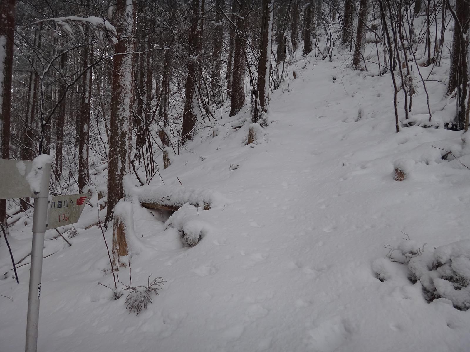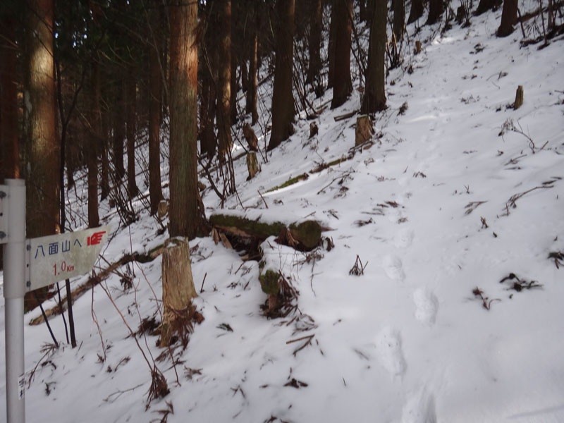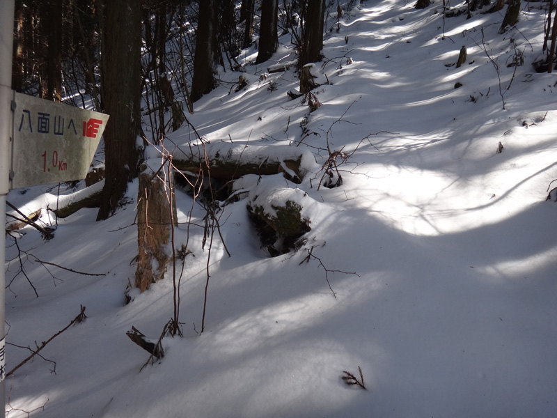 途中で「八面山1km」の看板が。 あと1kmか、頑張ろう。 その後も急傾斜が続く。