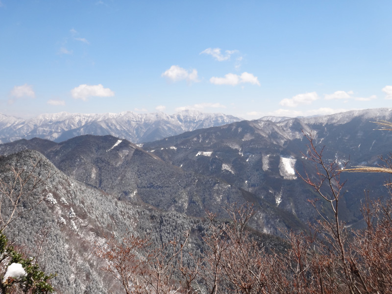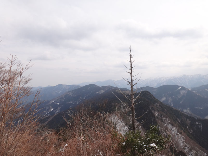 最後は岩を這い上がるような感じで、山頂到着。 木々の切れ間から、素晴らしい山々の景色が楽しめる。 1300m峰とは思えない景色だな。