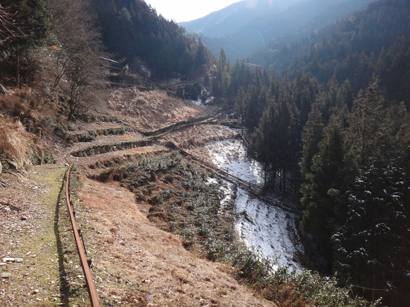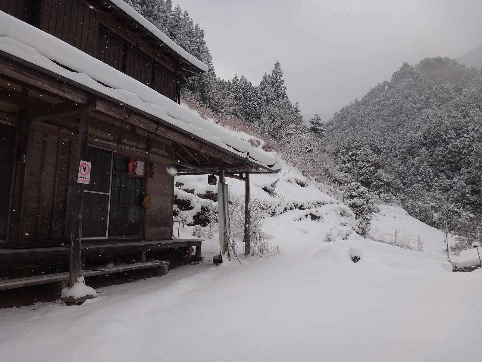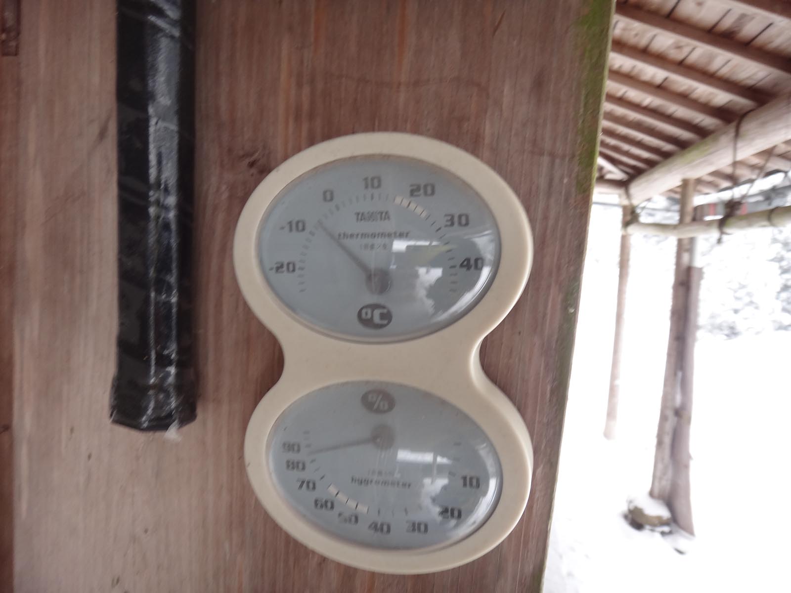 樹林帯の中に設置された、荷物用モノレールの脇を歩いて行く。 しばらく歩いて、たまに人に遭遇する民家に到着。 ここの軒先を借りて休むことに。 木のほうきが置いてあったので、それで雪を払って座って休憩をする。 柱の横に温度計がかかっていて、気温はマイナス6度を指していた。