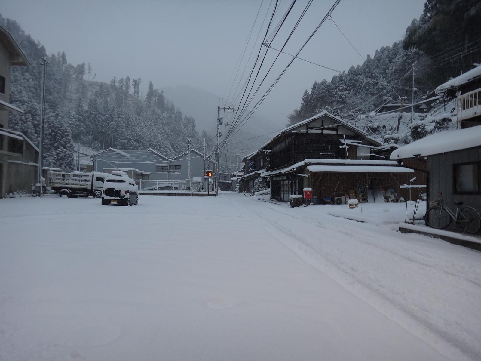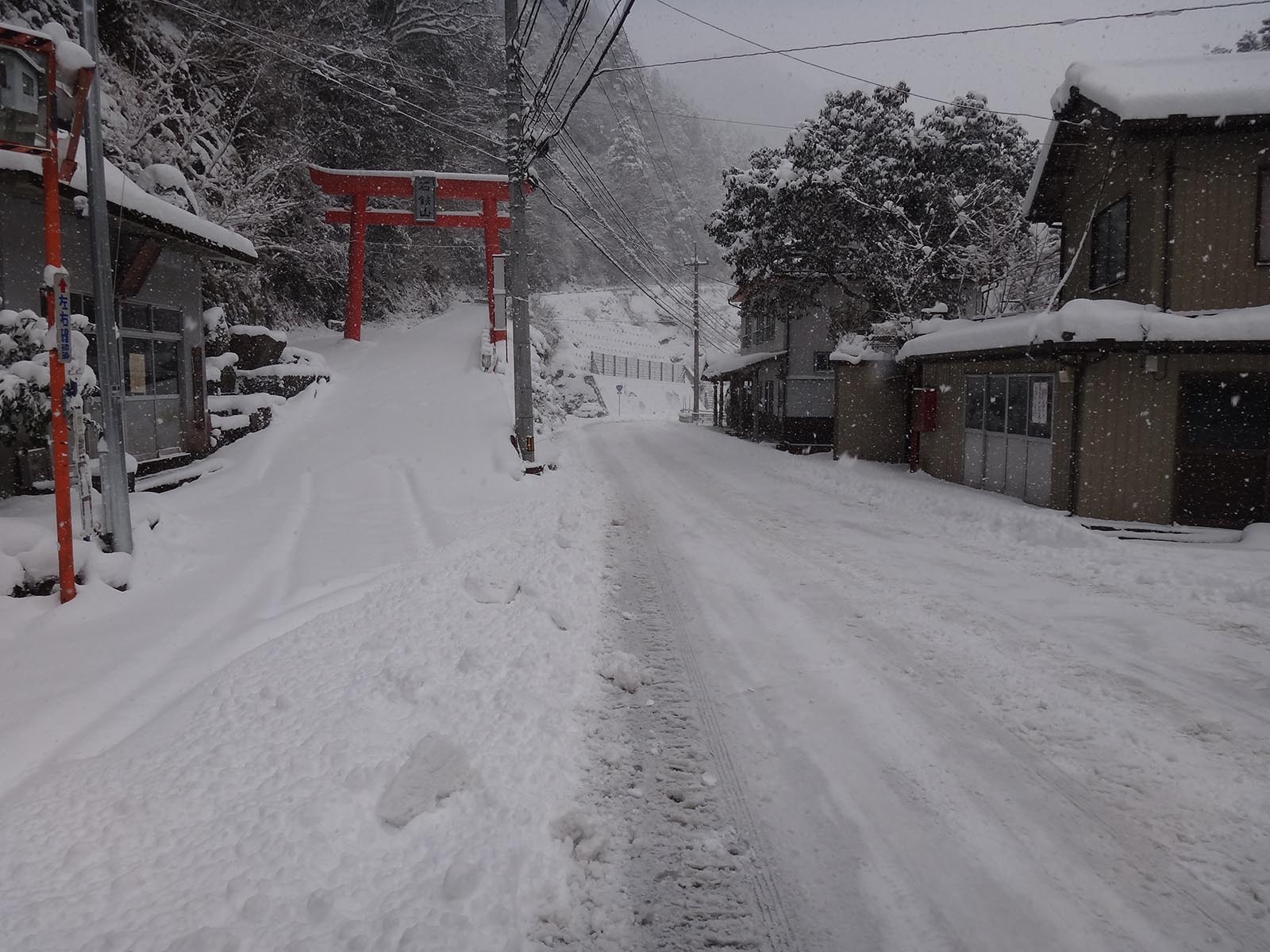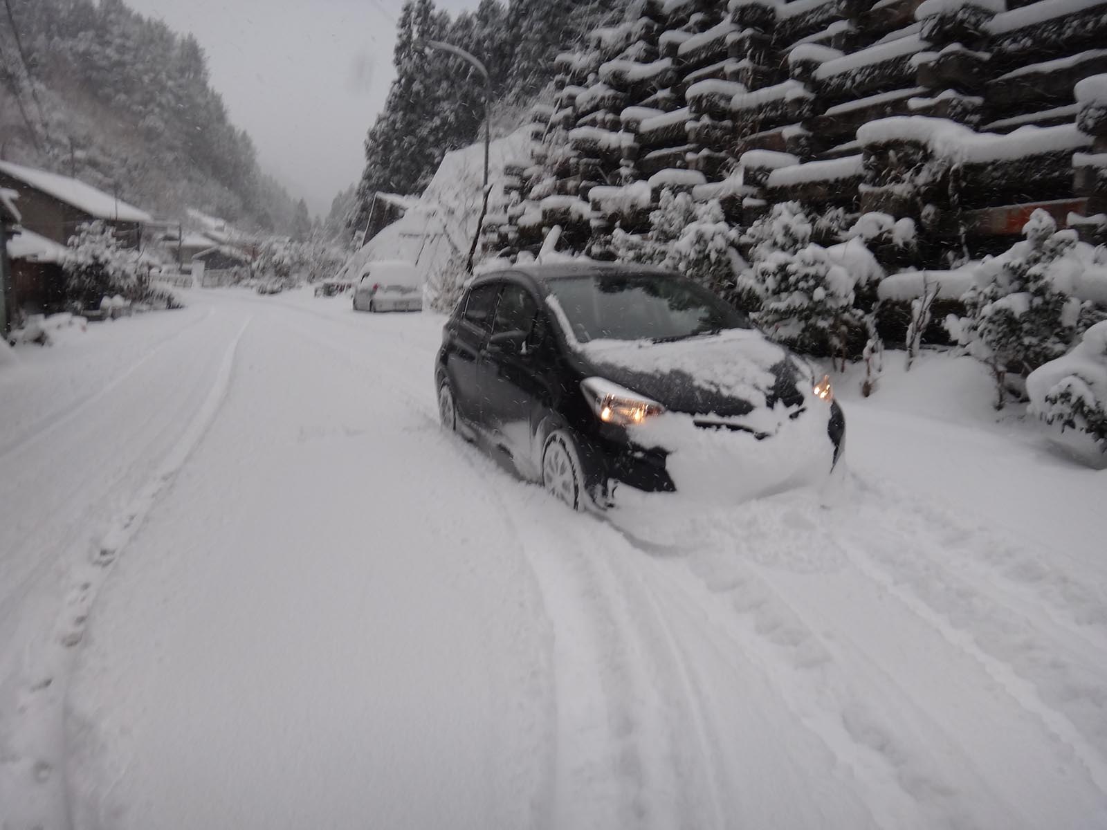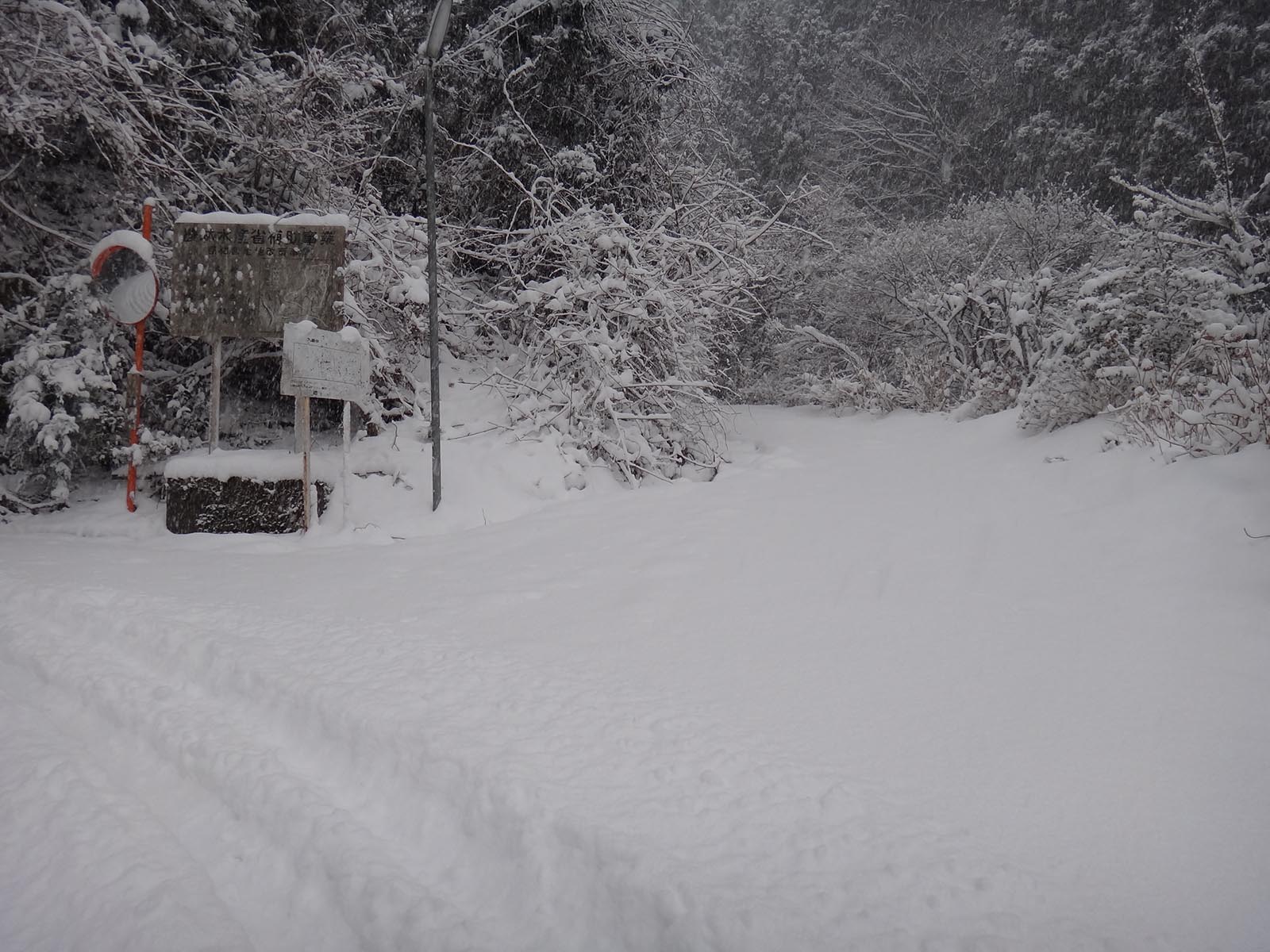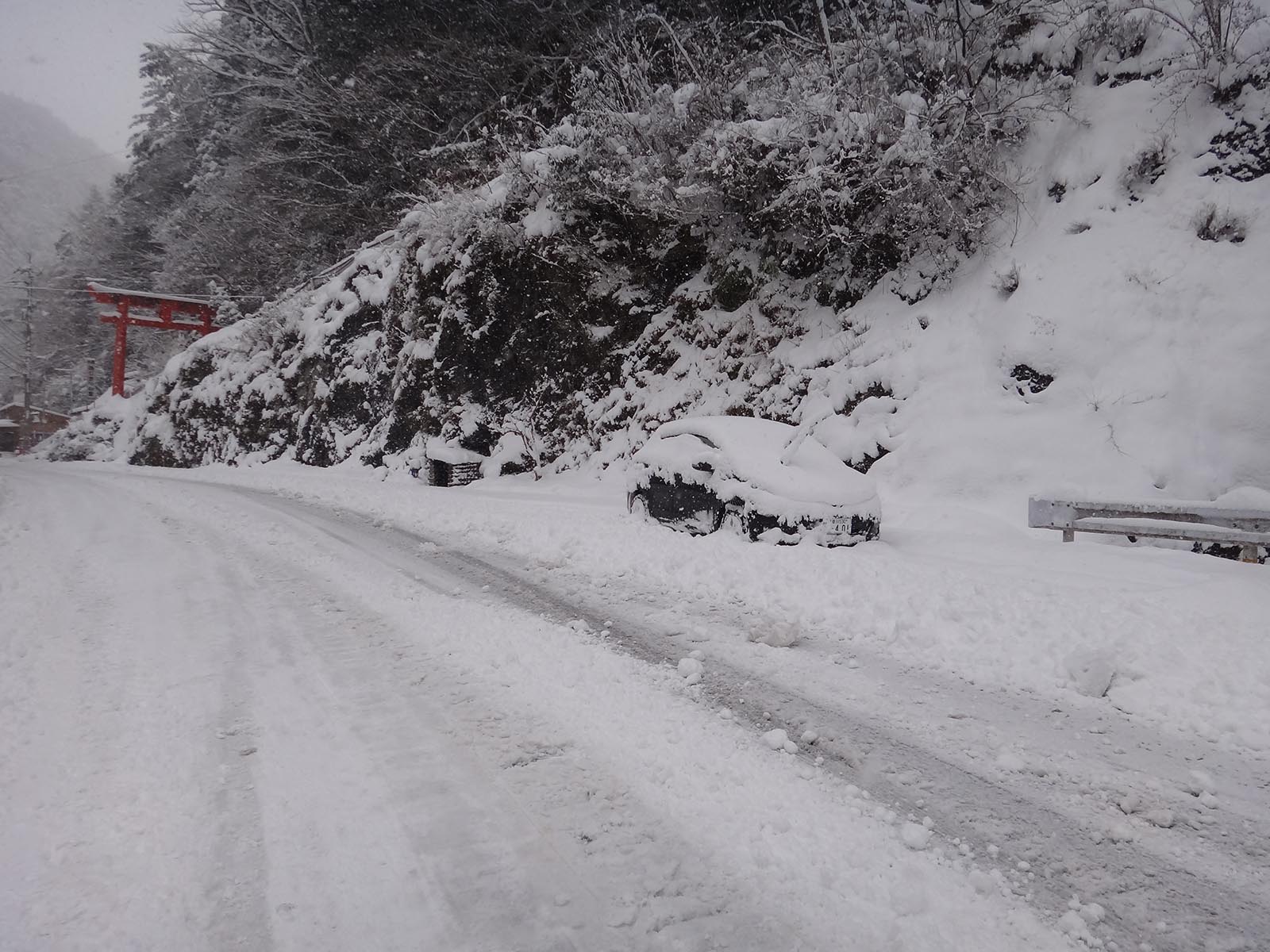 しばらくは走れたものの、橋を越えた商店の前で、タイヤ跡はなくなる。 タイヤ跡の無い、積雪20cm以上の道を、この車じゃ走ることができない。 距離が近いならまだしも、ここから登山口までは6km以上ある。 車で突入するのは現実的じゃないし、歩けない距離じゃないけど、黒笠山の難易度を考えると、登山口まで6km以上歩くのも現実的ではない。