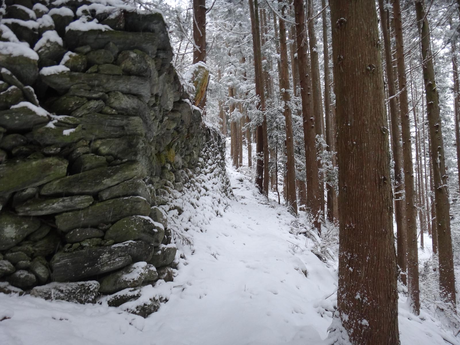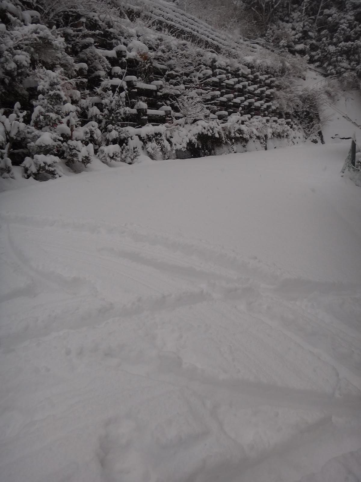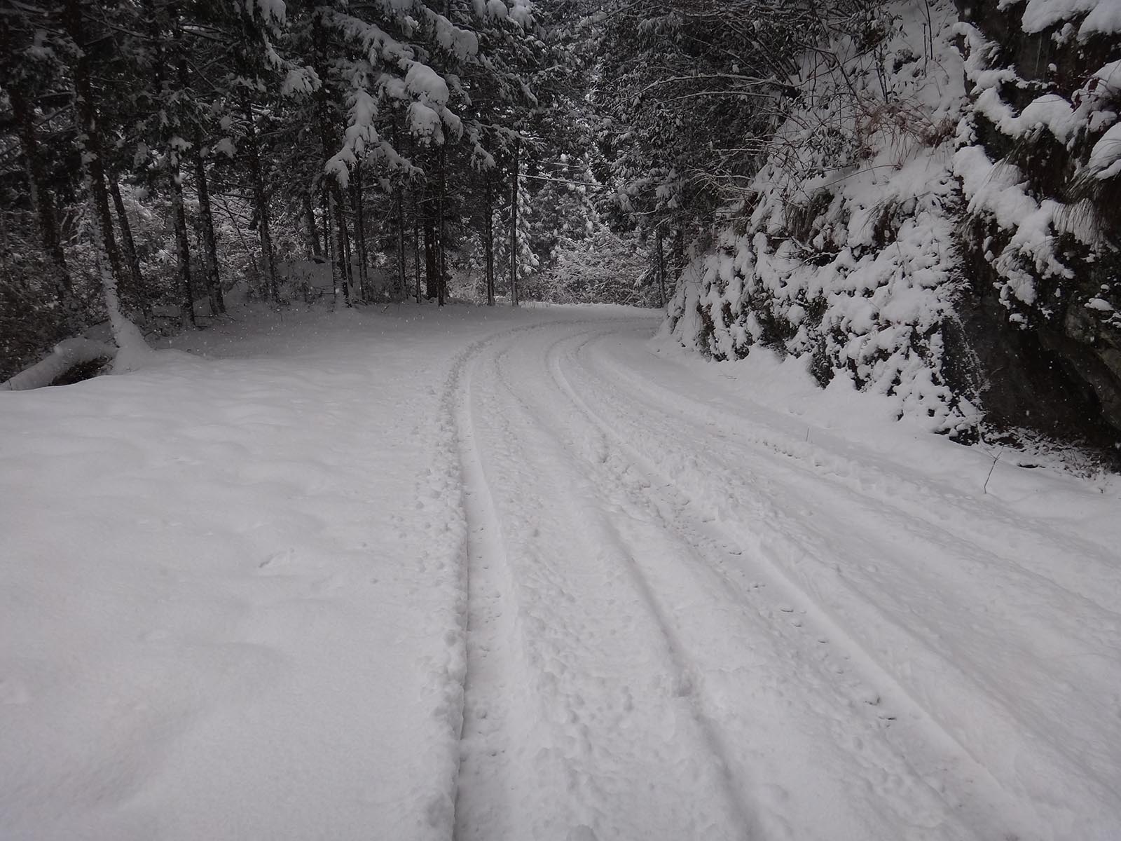 足跡も、タイヤの跡も無い、九藤中登山口に向かって歩いて行く。 積雪は20cmほど。 登山道じゃなく、車道なので、傾斜はそれほどでもないし、これくらいの積雪なら普通に歩いているのとほとんど変わらない。 そう思って一歩一歩踏みしめていたら、すぐに後ろから車がやって来てしまった。 避けて車が先に行ったのだけど、綺麗な新雪の道路は、タイヤの跡がついてしまった…… 見た目的には悪くなってしまったが、タイヤ跡を歩いたほうが圧倒的に楽ではある。