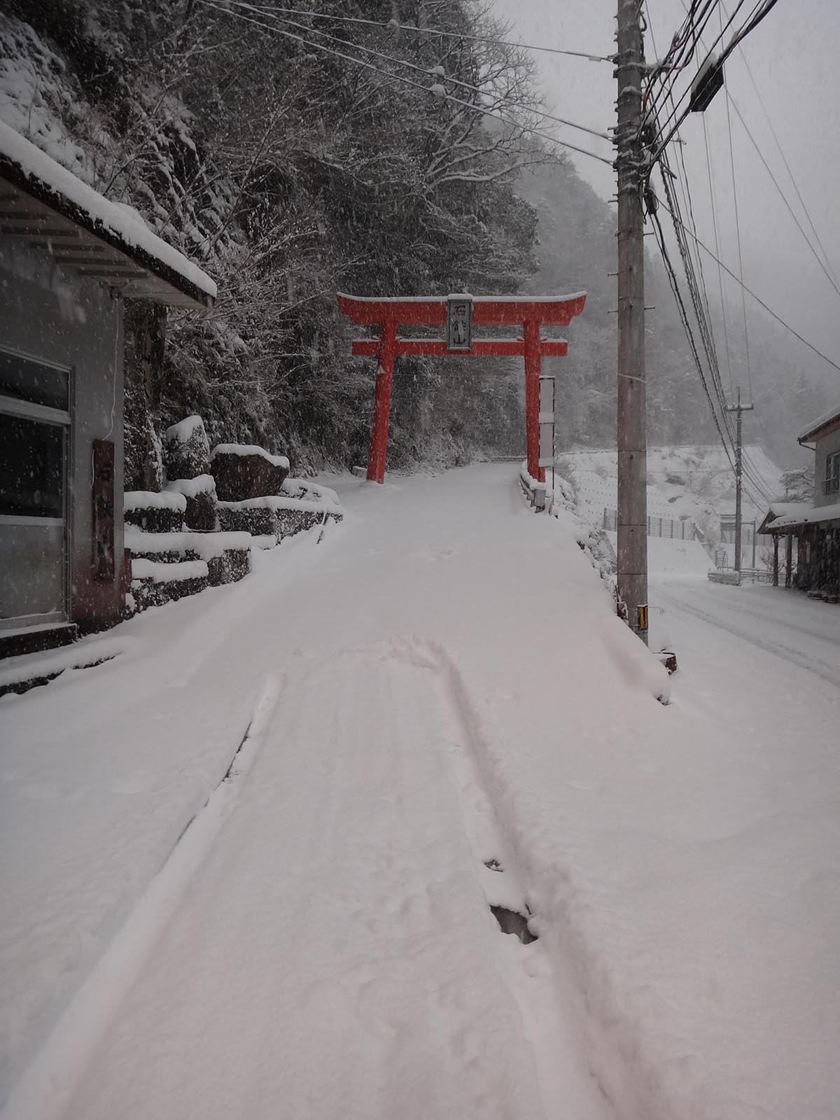 そこに自転車を置いて、Uターン。 国道438号線に戻ってきて、来た道を引き返す。 津志嶽に登る、石鉄神社と書かれた大きな鳥居の手前が、国道の幅が広くなっていたので、そこに駐車。 今日はここから登る。