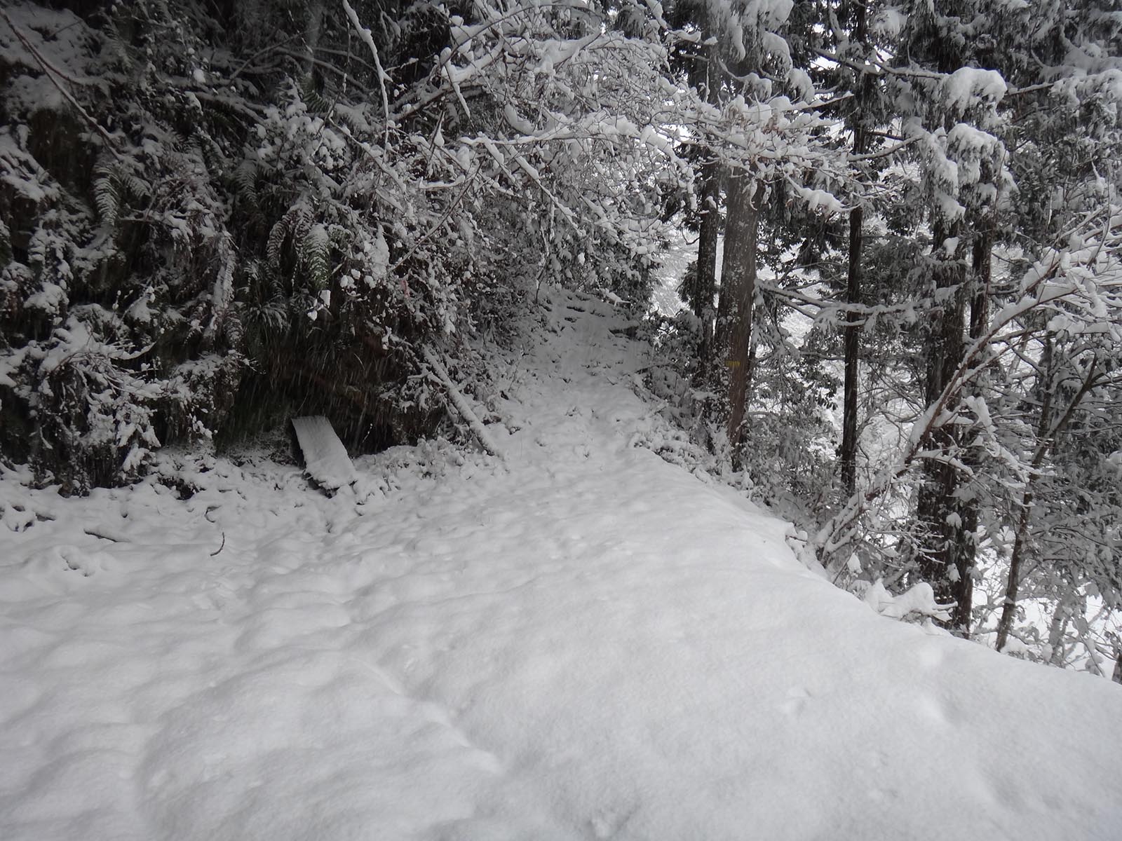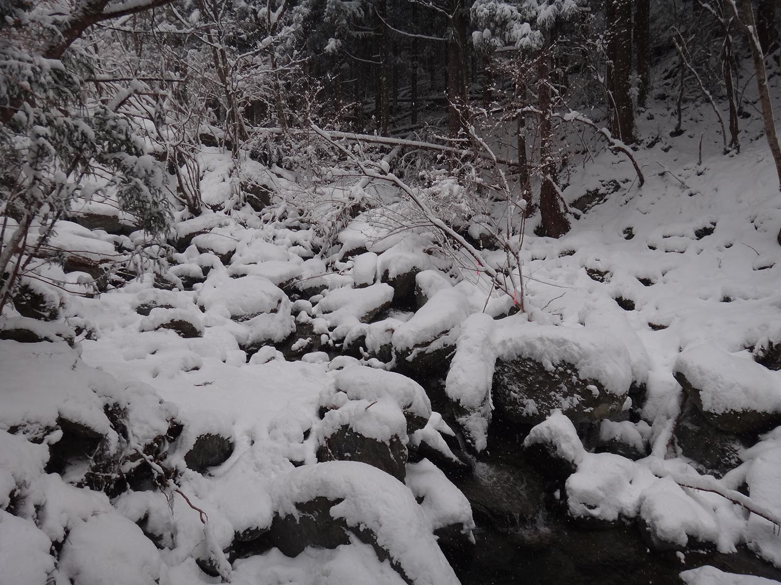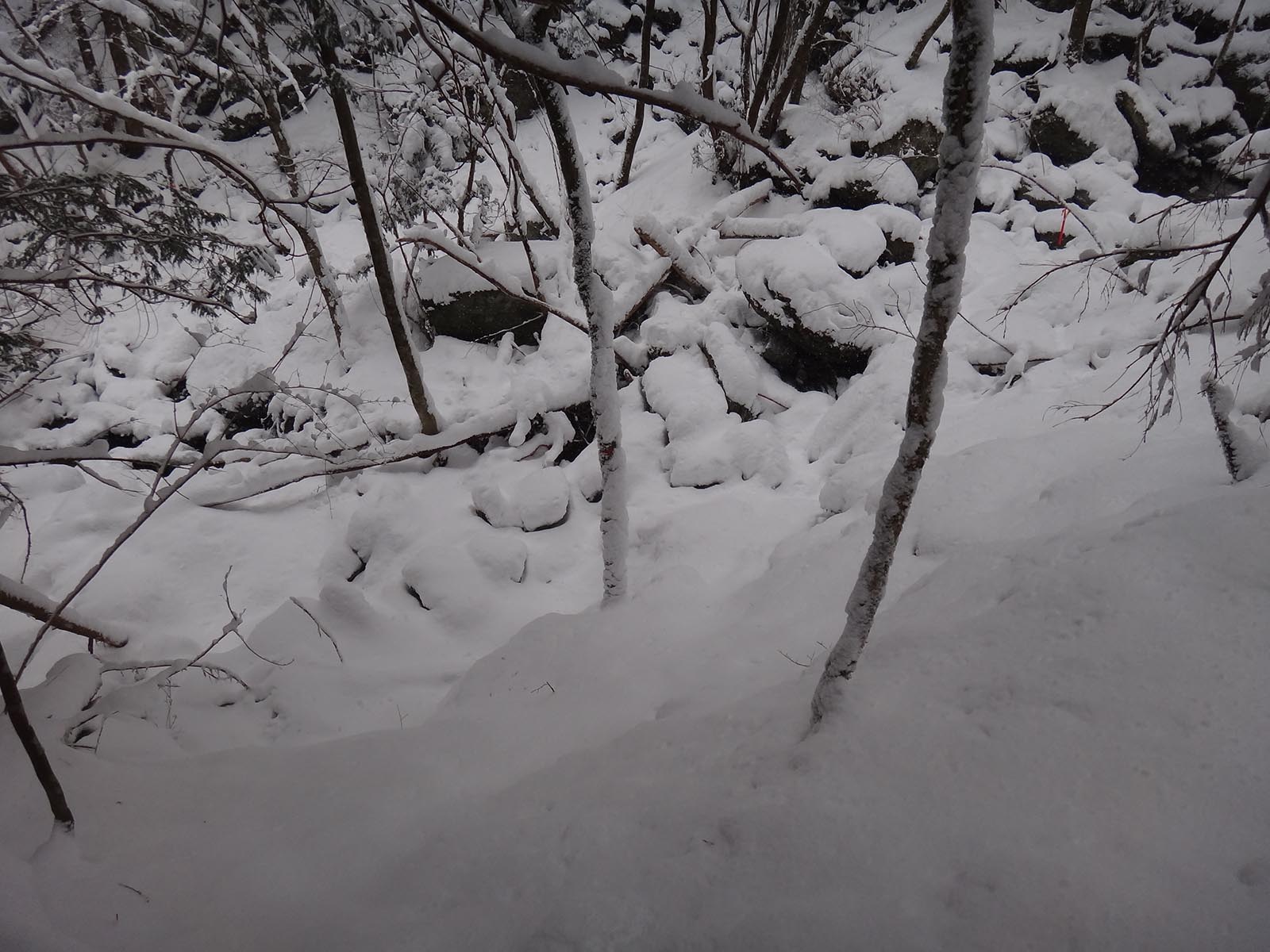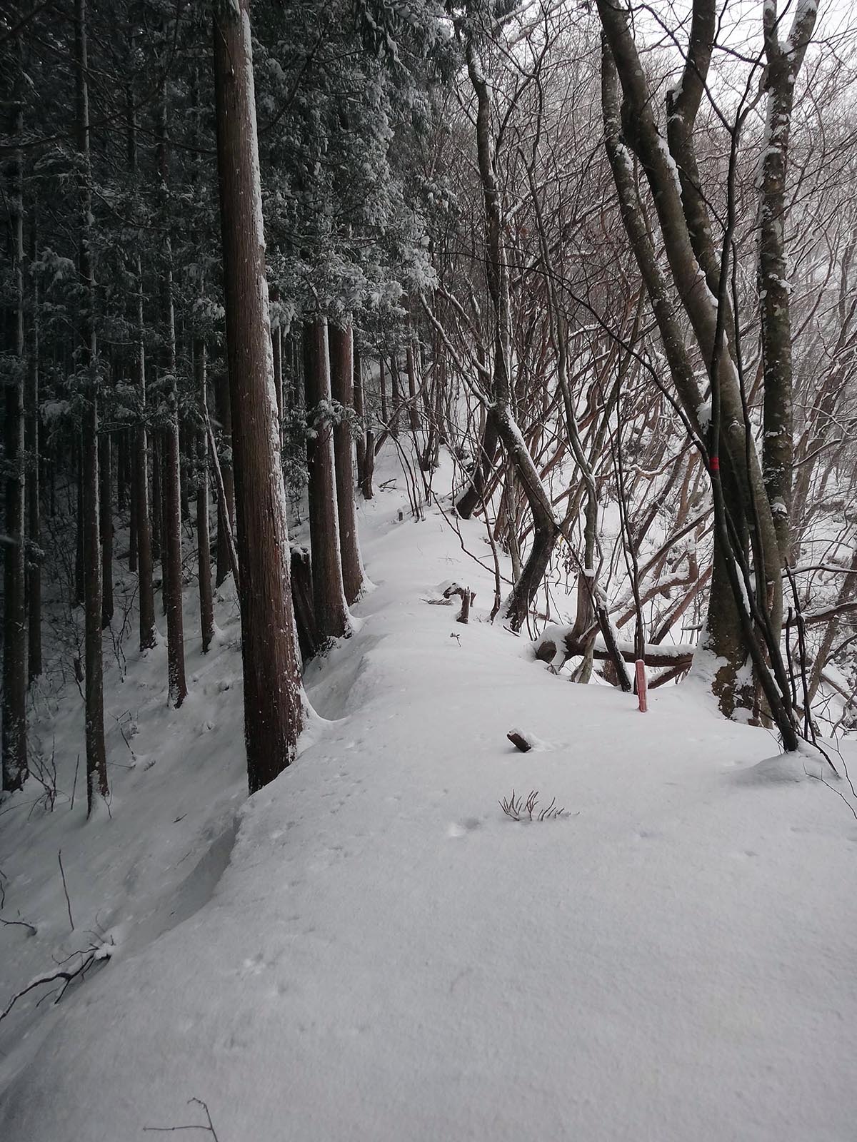 かなりの急傾斜で、雪で滑る道を慎重に下りていく。 定期的にピンクテープが出現するので、少し安心。