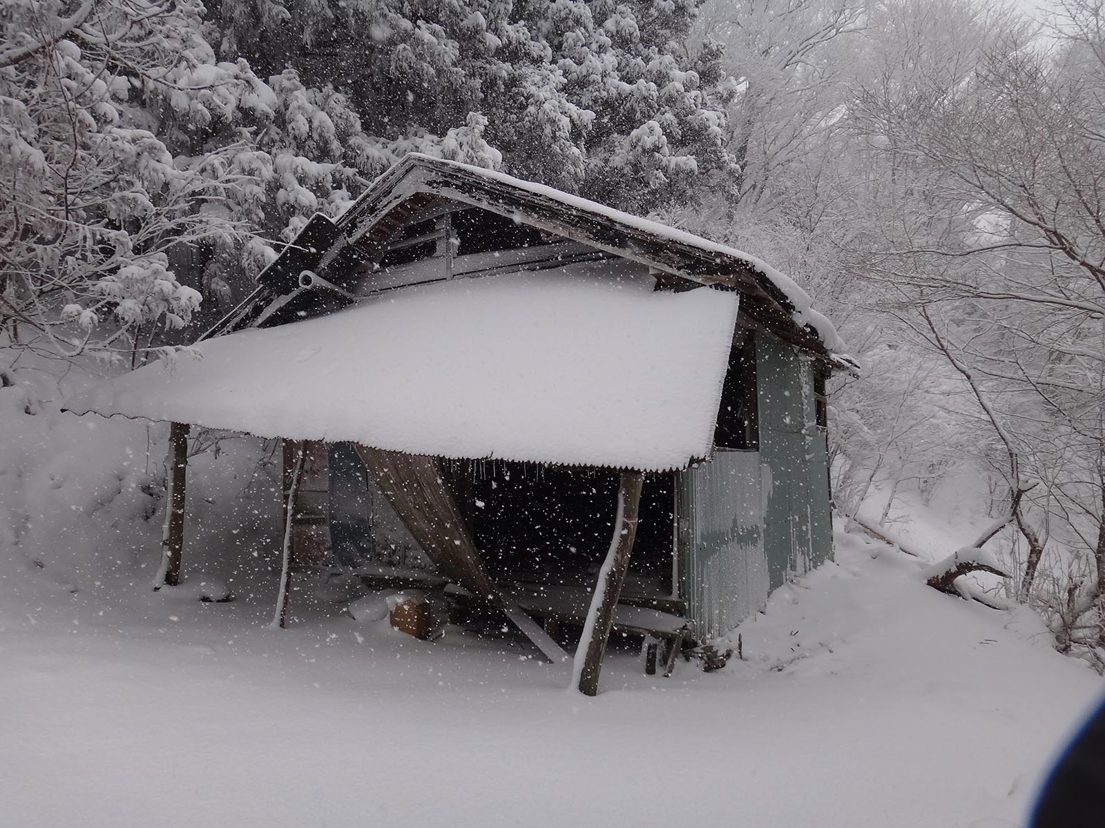 廃屋で扉すらないけれど、雪がしのげるのが非常にありがたい。 風も無いし、休憩用にダウンジャケットを着込んでいるので寒さは無いな。 手足の指先が冷たくて痛いくらい。