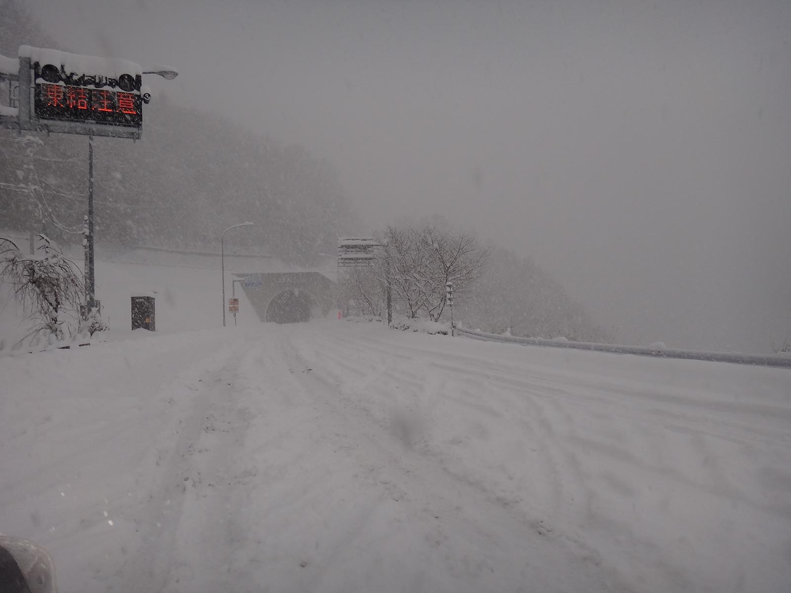 三頭トンネルに向けての登りで一気に積雪量が増えた。 路面には20cmくらい積もっており、タイヤ跡をたどっていくのだが、フロントバンパーが路面の雪を跳ね上げて、それがフロントガラスに常時かぶっているような状態になり、ワイパーを早く動かさないと前が全く見えない。 しかもフロントガラスに雪がつくと、一気に温度が低下して、ガラスがすぐに凍りつく、そして前が見えない…… 雪を跳ね上げない速度、時速30kmも出せないスピードでゆっくりと登っていく。