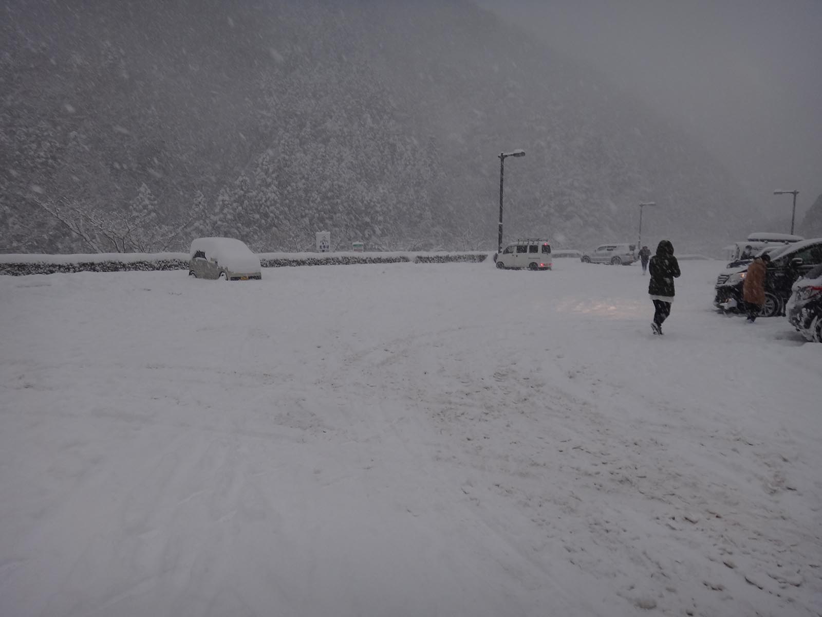 駐車地点の上に止まっていた車はやはり登山者のようで、地面にわずかに積もって雪に足跡がついていた。