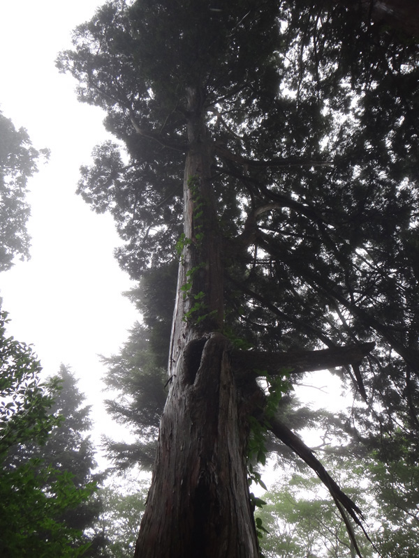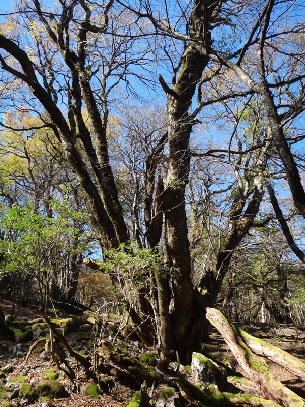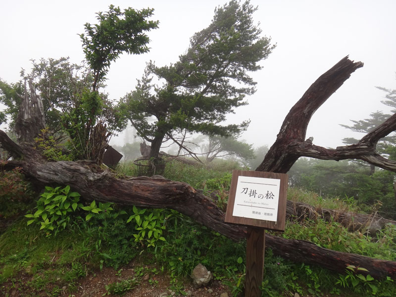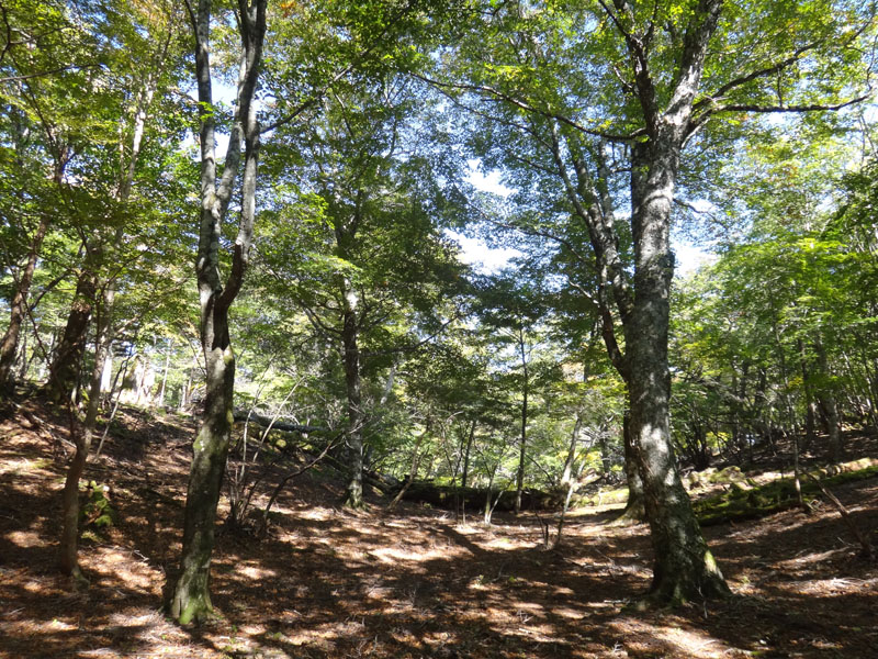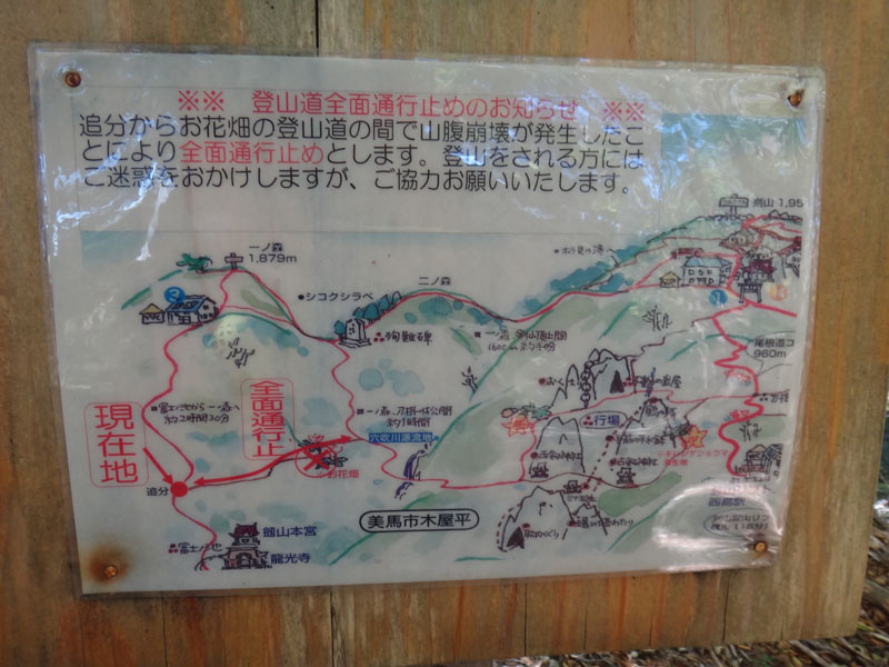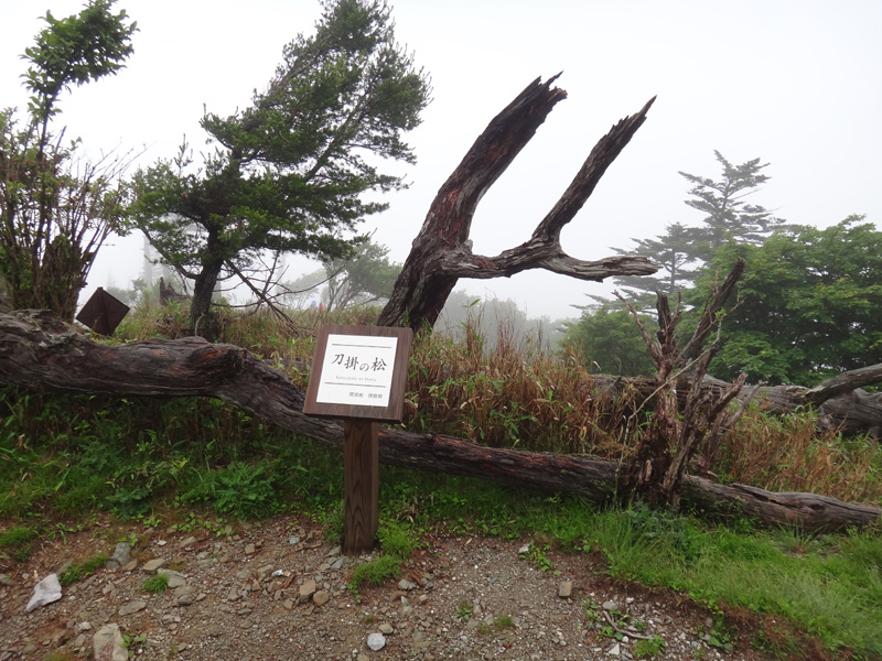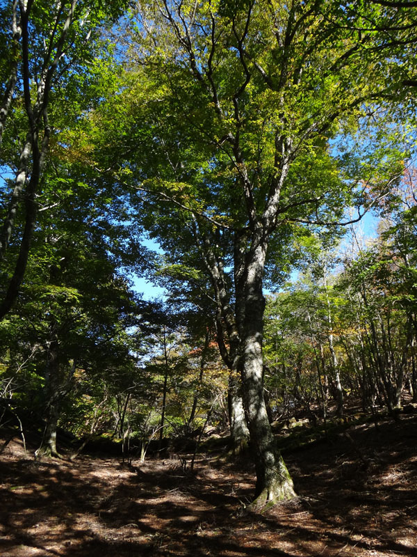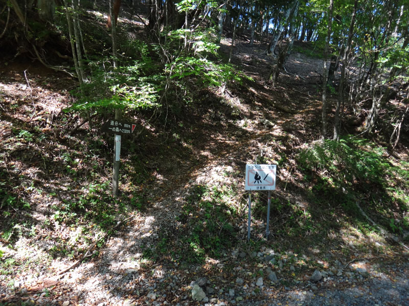さて、次のポイントは追分だ。 追分に向かって歩いていく。 途中で60歳くらいの夫婦を追い越す。 この夫婦は剣山に行きたかったらしいが、国道通行止めのため、仕方なく一ノ森に来たみたい。 途中で巨大なブナの木を見ながら、すぐに追分まで到着。 追分でも休憩をする。 さて、ここからのルートは、お花畑方面に向かって歩いていく。 確か2年前だと思うのだけど、追分~お花畑区間で崩落があり、それから通行止めになっているルート。 だが、山小屋で聞いた話だと、崩落したのは50mくらいで、上から迂回すれば通れるとのことだった。 聞いたのも2年前なので、今はどうなっているかわからないが…… それと、お花畑→追分は歩いたことがあるけど、追分→お花畑は歩いたことがないので、ぜひ歩いておきたいルート。 もしどうしても危ないなら戻ってくればいいし。